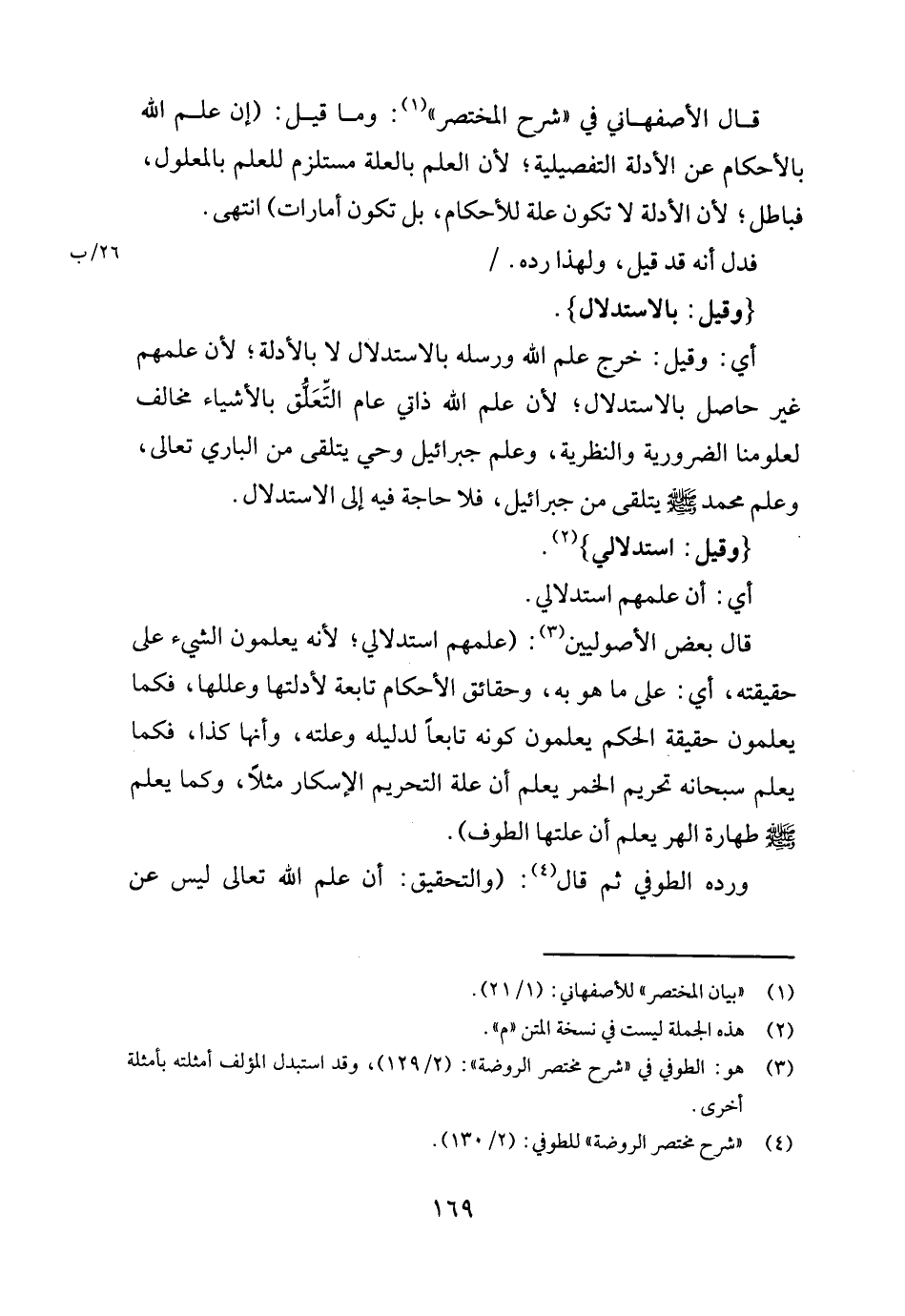 قَالَ بعض الْأُصُولِيِّينَ: (علمهمْ استدلالي؛ لِأَنَّهُ يعلمُونَ الشَّيْء على حَقِيقَته، أَي: على مَا هُوَ بِهِ، وحقائق الْأَحْكَام تَابِعَة لأدلتها وعللها، فَكَمَا يعلمُونَ حَقِيقَة الحكم يعلمُونَ كَونه تَابعا لدليله وعلته، وَأَنَّهَا كَذَا، فَكَمَا يعلم سُبْحَانَهُ تَحْرِيم الْخمر يعلم أَن عِلّة التَّحْرِيم الْإِسْكَار مثلا، وكمل يعلم - صَلَّى اللَّهُ عَلَيْهِ وَسَلَّم َ - طَهَارَة الهر يعلم أَن علتها الطوف) .