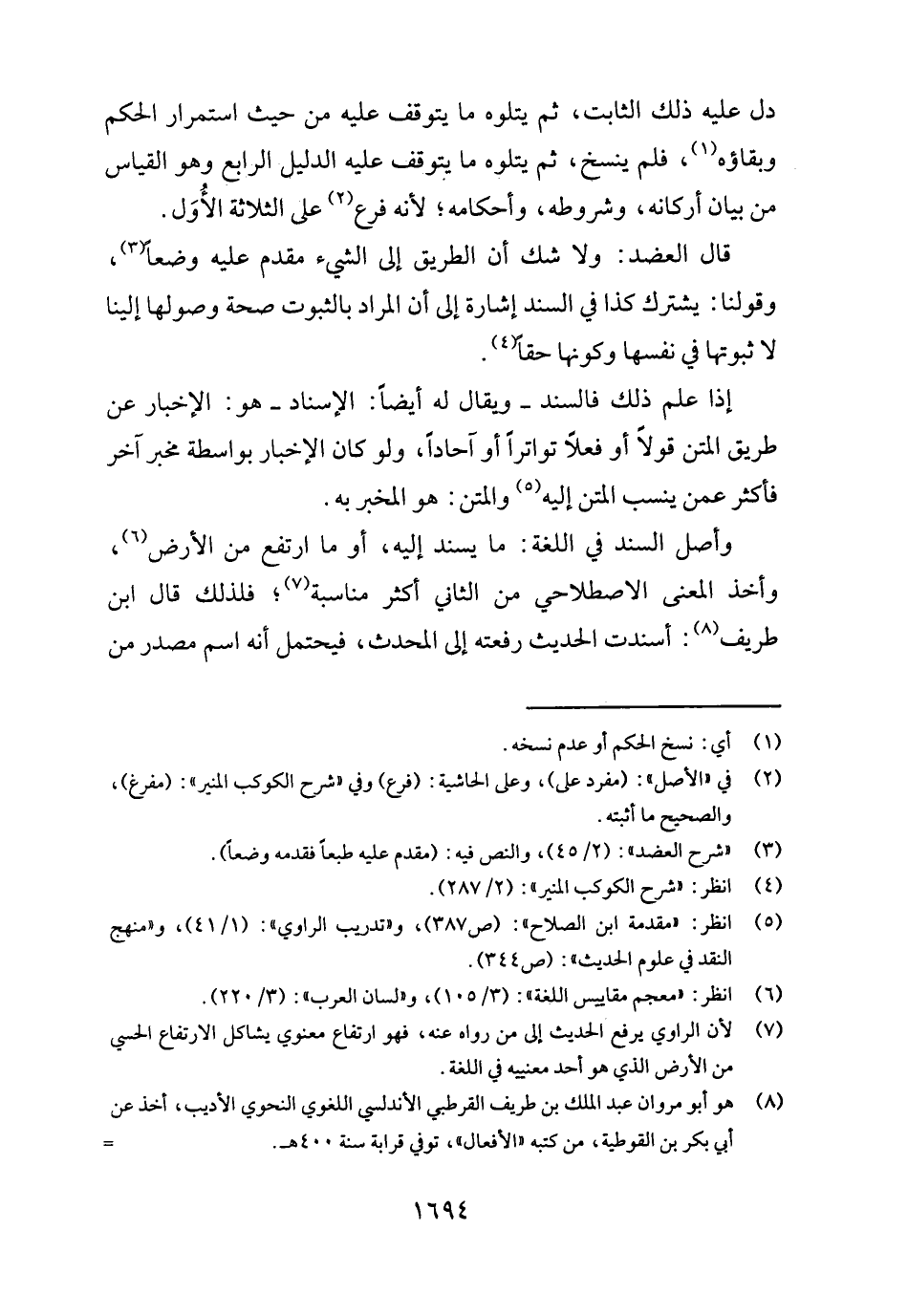 قَالَ الْعَضُد: وَلَا شكّ أَن الطَّرِيق إِلَى الشَّيْء مقدم عَلَيْهِ وضعا، وَقَوْلنَا: يشْتَرك كَذَا فِي السَّنَد إِشَارَة إِلَى أَن المُرَاد بالثبوت صِحَة وصولها إِلَيْنَا لَا ثُبُوتهَا فِي نَفسهَا وَكَونهَا حَقًا.