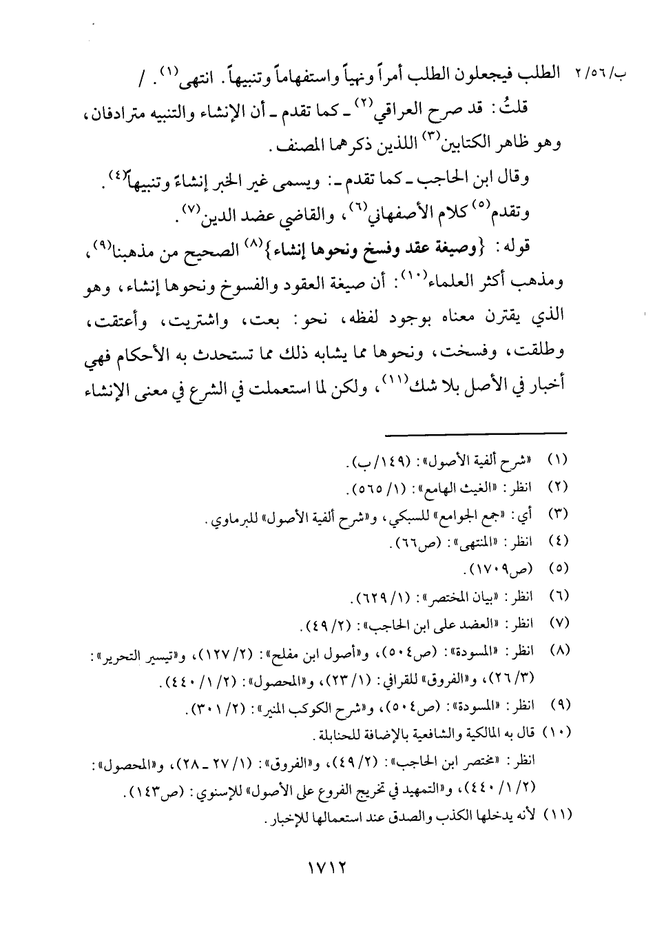 قَوْله: {وَصِيغَة عقد وَفسخ وَنَحْوهَا إنْشَاء} الصَّحِيح من مَذْهَبنَا، وَمذهب أَكثر الْعلمَاء: أَن صِيغَة الْعُقُود والفسوخ وَنَحْوهَا إنْشَاء، وَهُوَ الَّذِي يقْتَرن مَعْنَاهُ بِوُجُود لَفظه، نَحْو: بِعْت، واشتريت، وأعتقت، وَطلقت، وفسخت، وَنَحْوهَا مِمَّا يشابه ذَلِك مِمَّا تستحدث بِهِ الْأَحْكَام فَهِيَ أَخْبَار فِي الأَصْل بِلَا شكّ، وَلَكِن لما اسْتعْملت فِي الشَّرْع فِي معنى الْإِنْشَاء