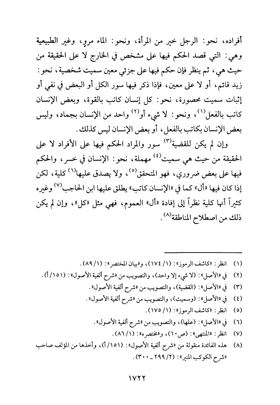 أَفْرَاده، نَحْو: الرجل خير من الْمَرْأَة، وَنَحْو: المَاء مرو، وَغير الطبيعية وَهِي: الَّتِي قصد الحكم فِيهَا على مشخص فِي الْخَارِج لَا على الْحَقِيقَة من حَيْثُ هِيَ، ثمَّ ينظر فَإِن حكم فِيهَا على جزئي معِين سميت شخصية، نَحْو: زيد قَائِم، أَو لَا على معِين، فَإِذا ذكر فِيهَا سور الْكل أَو الْبَعْض فِي نفي أَو إِثْبَات سميت محصورة، نَحْو: كل إِنْسَان كَاتب بِالْقُوَّةِ، وَبَعض الْإِنْسَان كَاتب بِالْفِعْلِ، وَنَحْو: لَا شَيْء أَو وَاحِد من الْإِنْسَان بجماد، وَلَيْسَ بعض الْإِنْسَان بكاتب بِالْفِعْلِ، أَو بعض الْإِنْسَان لَيْسَ كَذَلِك.