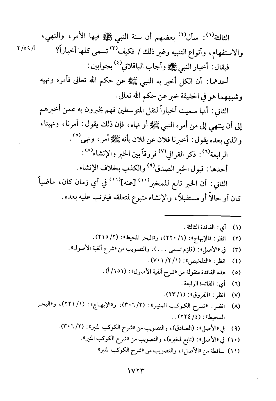 فَيُقَال: أَخْبَار النَّبِي - صَلَّى اللَّهُ عَلَيْهِ وَسَلَّم َ - وَأجَاب الباقلاني بجوابين أَحدهمَا: أَن الْكل أخبر بِهِ النَّبِي - صَلَّى اللَّهُ عَلَيْهِ وَسَلَّم َ - عَن حكم الله تَعَالَى فَأمره وَنَهْيه وشبههما هُوَ فِي الْحَقِيقَة خبر عَن حكم الله تَعَالَى.