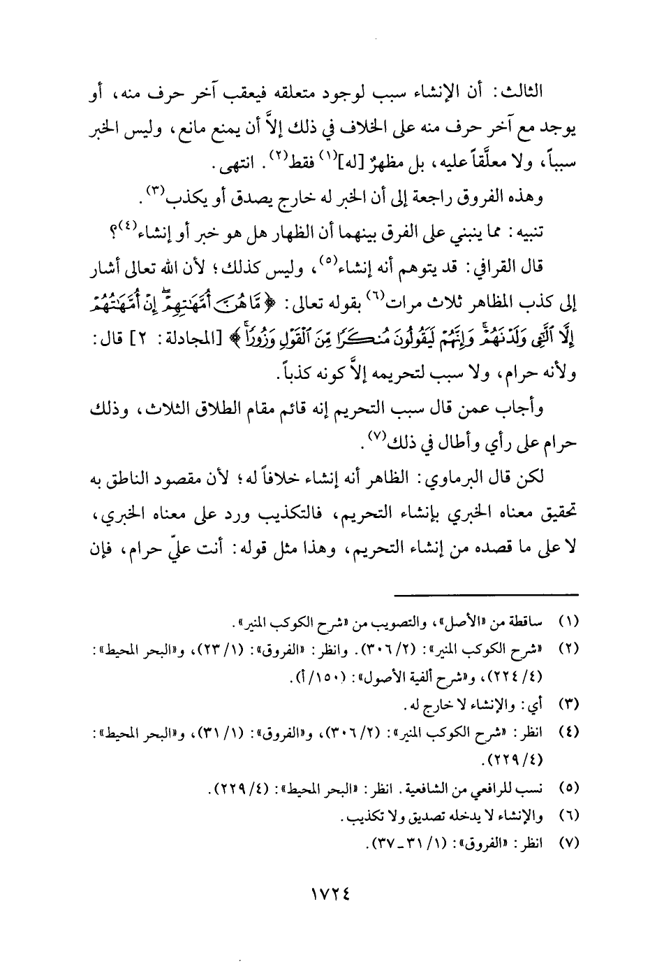 قَالَ الْقَرَافِيّ: قد يتَوَهَّم أَنه إنْشَاء، وَلَيْسَ كَذَلِك؛ لِأَن الله تَعَالَى أَشَارَ إِلَى كذب الْمظَاهر ثَلَاث مَرَّات بقوله تَعَالَى: {ماهن أمهاتهم إِن أمهاتهم إِلَّا الائي ولدنهم وَإِنَّهُم ليقولون مُنْكرا من القَوْل وزوراً} [المجادلة: ٢] قَالَ: وَلِأَنَّهُ حرَام، وَلَا سَبَب لتحريمه إِلَّا كَونه كذبا.
