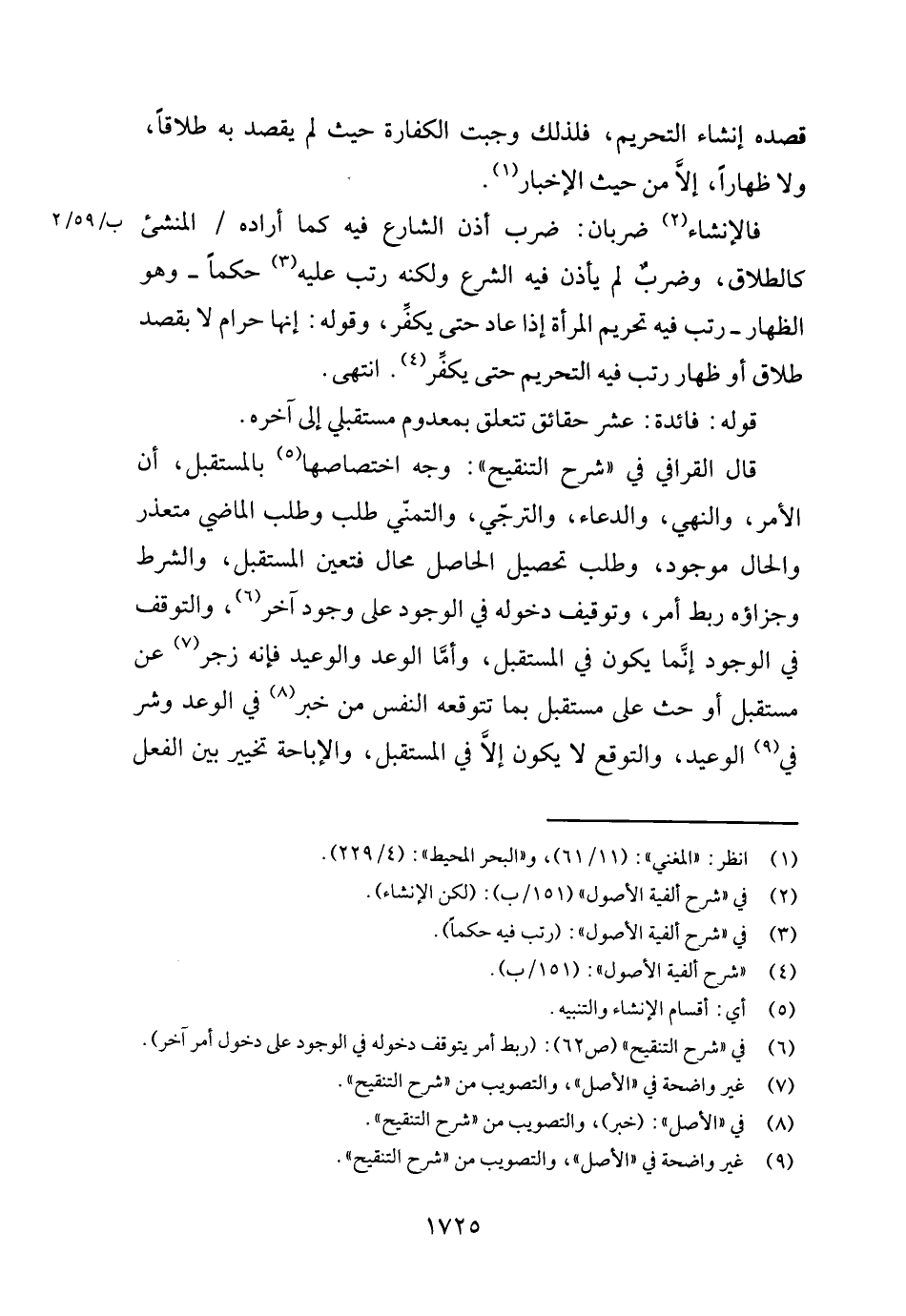 قَالَ الْقَرَافِيّ فِي " شرح التَّنْقِيح ": وَجه اختصاصها بالمستقبل، أَن الْأَمر، وَالنَّهْي، وَالدُّعَاء، والترجي، وَالتَّمَنِّي طلب وَطلب الْمَاضِي مُتَعَذر وَالْحَال مَوْجُود، وَطلب تَحْصِيل الْحَاصِل محَال فَتعين الْمُسْتَقْبل، وَالشّرط وجزاؤه ربط أَمر، وتوقيف دُخُوله فِي الْوُجُود على وجود آخر، والتوقف فِي الْوُجُود إِنَّمَا يكون فِي الْمُسْتَقْبل، وَأما الْوَعْد والوعيد فَإِنَّهُ زجر عَن مُسْتَقْبل أَو حث على مُسْتَقْبل بِمَا تتوقعه النَّفس من خبر فِي الْوَعْد وَشر فِي الْوَعيد، والتوقع لَا يكون إِلَّا فِي الْمُسْتَقْبل، وَالْإِبَاحَة تَخْيِير بَين الْفِعْل