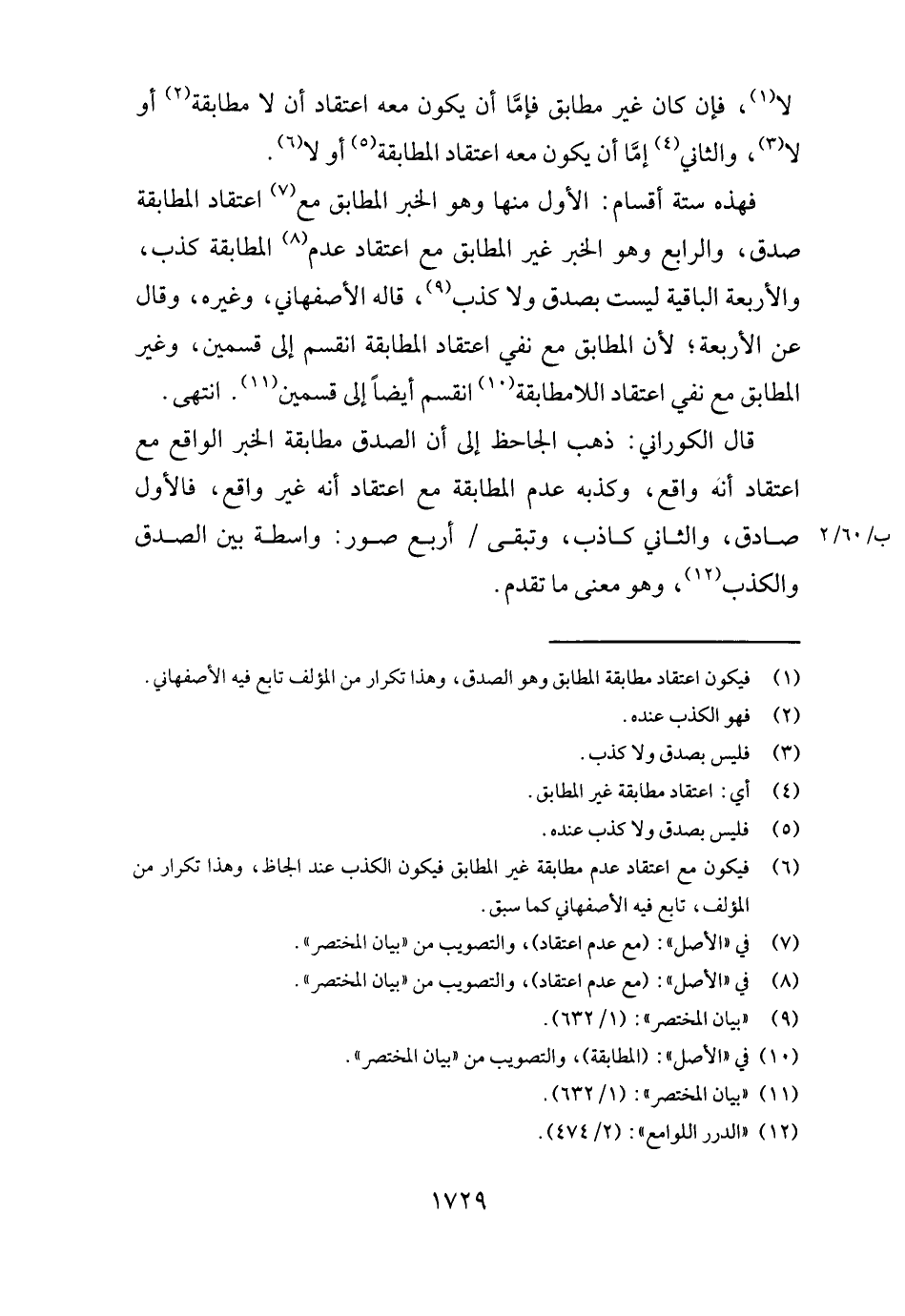 فَهَذِهِ سِتَّة أَقسَام: الأول مِنْهَا وَهُوَ الْخَبَر المطابق مَعَ اعْتِقَاد الْمُطَابقَة صدق، وَالرَّابِع وَهُوَ الْخَبَر غير المطابق مَعَ اعْتِقَاد عدم الْمُطَابقَة كذب، وَالْأَرْبَعَة الْبَاقِيَة لَيست بِصدق وَلَا كذب، قَالَه الْأَصْفَهَانِي، وَغَيره، وَقَالَ عَن الْأَرْبَعَة؛ لِأَن المطابق مَعَ نفي اعْتِقَاد الْمُطَابقَة انقسم إِلَى قسمَيْنِ، وَغير المطابق مَعَ نفي اعْتِقَاد اللامطابقة انقسم أَيْضا إِلَى قسمَيْنِ. انْتهى.