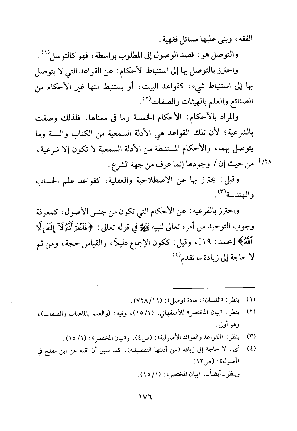 والتوصل هُوَ: قصد الْوُصُول إِلَى الْمَطْلُوب بِوَاسِطَة، فَهُوَ كالتوسل. وَاحْترز بالتوصيل بهَا إِلَى استنباط الْأَحْكَام: عَن الْقَوَاعِد الَّتِي لَا يتَوَصَّل بهَا إِلَى استنباط شَيْء، كقواعد الْبَيْت، أَو يستنبط مِنْهَا غير الْأَحْكَام من الصَّنَائِع وَالْعلم بالهيئات وَالصِّفَات.