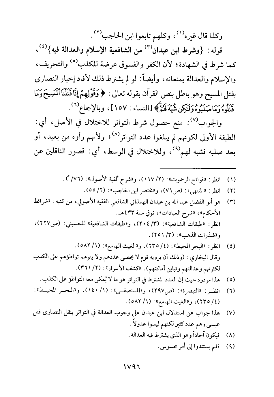 قَوْله: {وَشرط ابْن عَبْدَانِ من الشَّافِعِيَّة الْإِسْلَام وَالْعَدَالَة فِيهِ} ، كَمَا شَرط فِي الشَّهَادَة؛ لِأَن الْكفْر والفسوق عرضة للكذب والتحريف، وَالْإِسْلَام وَالْعَدَالَة يمنعانه، وَأَيْضًا: لَو لم يشْتَرط ذَلِك لأفاد إِخْبَار النَّصَارَى بقتل الْمَسِيح وَهُوَ بَاطِل بِنَصّ الْقُرْآن بقوله تَعَالَى: {وَقَوْلهمْ إِنَّا قتلنَا الْمَسِيح وَمَا قَتَلُوهُ وَمَا صلبوه وَلَكِن شبه لَهُم} [النِّسَاء: ١٥٧] ، وبالإجماع.