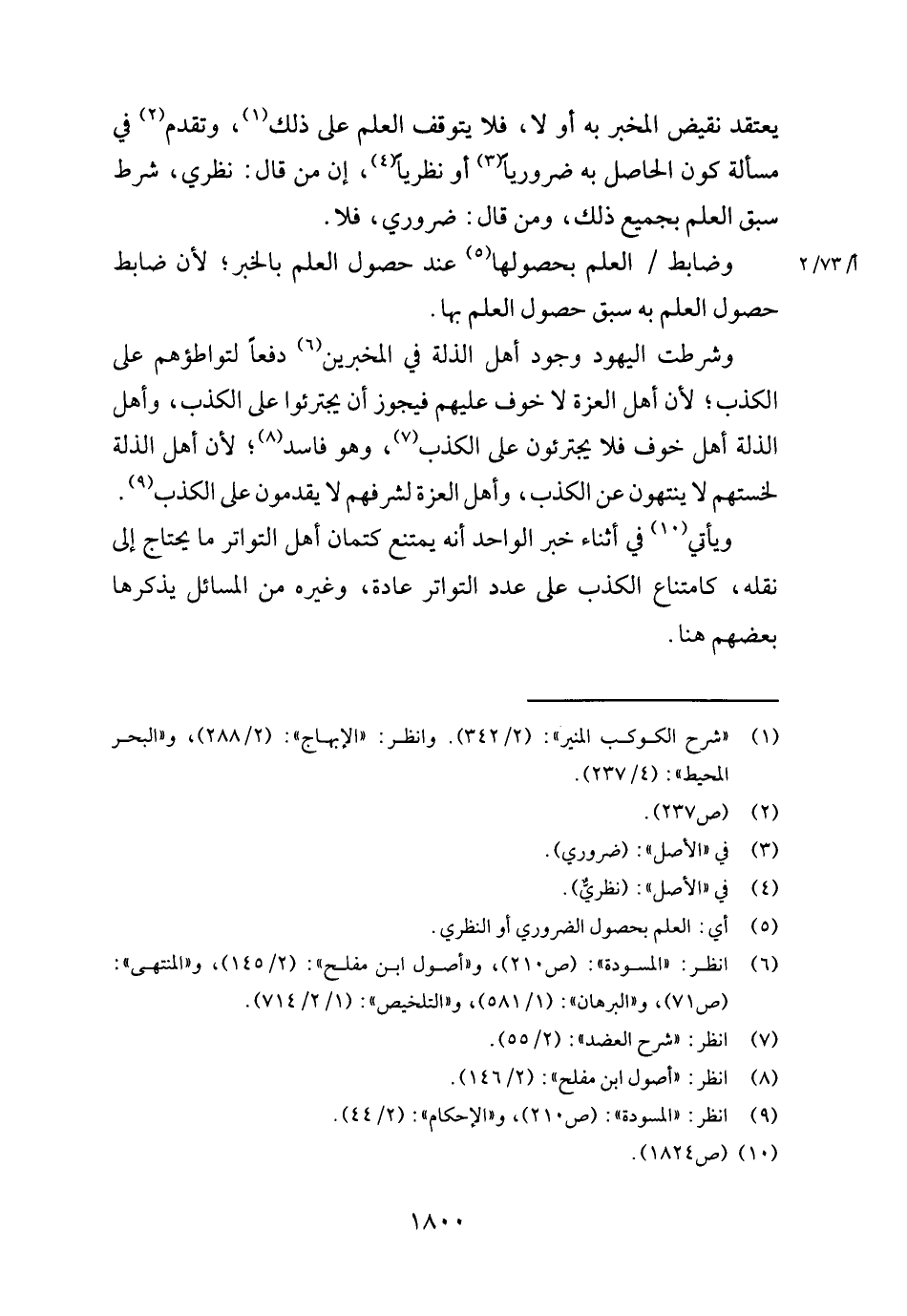 يعْتَقد نقيض الْمخبر بِهِ أَو لَا، فَلَا يتَوَقَّف الْعلم على ذَلِك، وَتقدم فِي مَسْأَلَة كَون الْحَاصِل بِهِ ضَرُورِيًّا أَو نظرياً، إِن من قَالَ: نَظَرِي، شَرط سبق الْعلم بِجَمِيعِ ذَلِك، وَمن قَالَ: ضَرُورِيّ، فَلَا.