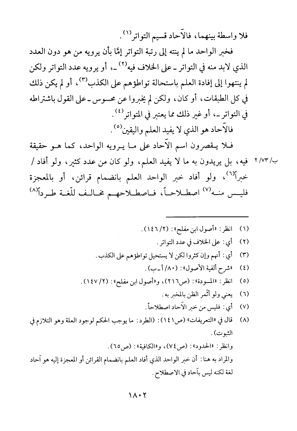 فَلَا يقصرون اسْم الْآحَاد على مَا يرويهِ الْوَاحِد، كَمَا هُوَ حَقِيقَة فِيهِ، بل يُرِيدُونَ بِهِ مَا لَا يُفِيد الْعلم، وَلَو كَانَ من عدد كثير، وَلَو أَفَادَ خَبرا، وَلَو أَفَادَ خبر الْوَاحِد الْعلم بانضمام قَرَائِن، أَو بالمعجزة فَلَيْسَ مِنْهُ اصْطِلَاحا، فاصطلاحهم مُخَالف للغة طرداً