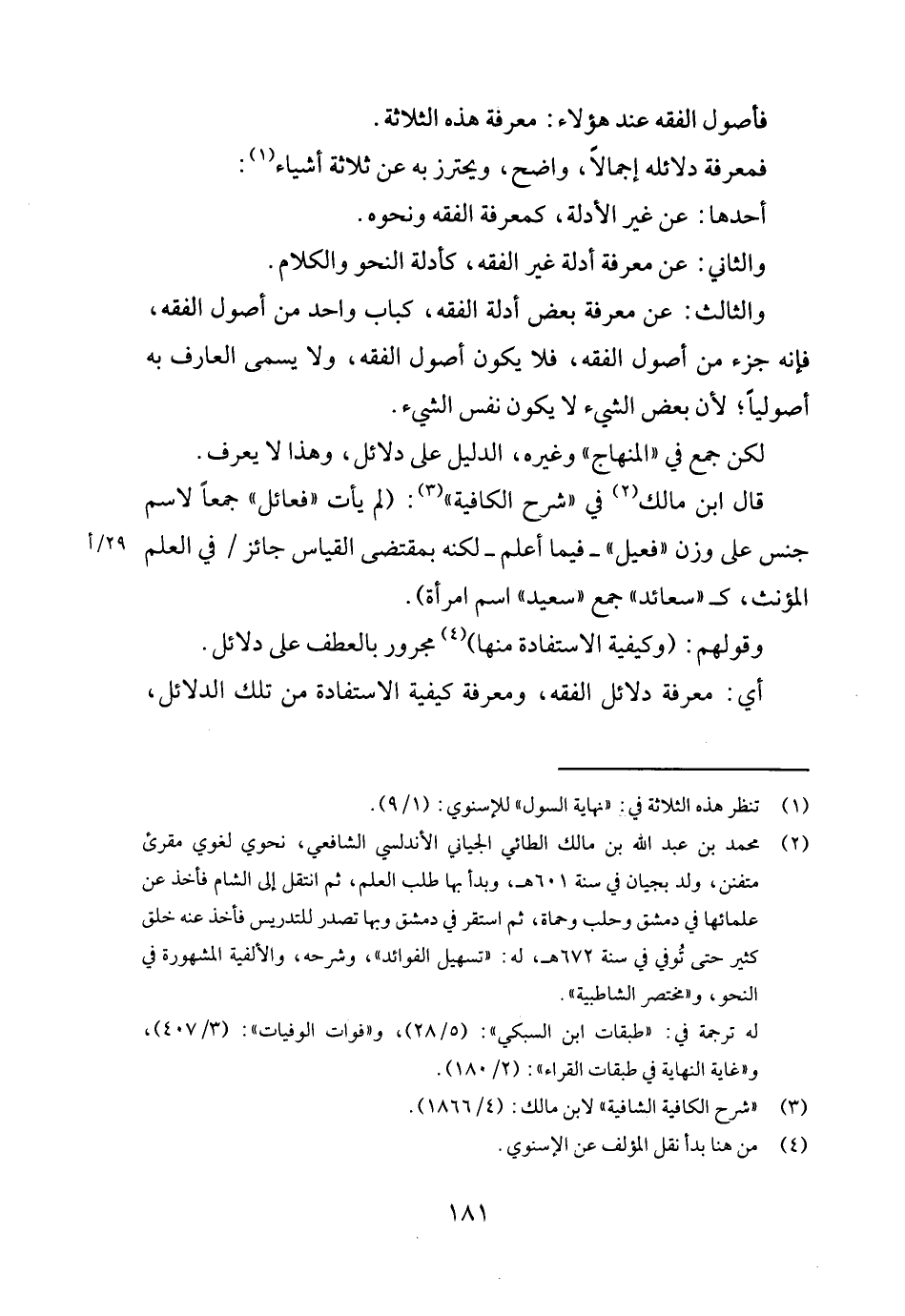 فمعرفة دلائله إِجْمَالا، وَاضح، ويحترز بِهِ عَن ثَلَاثَة أَشْيَاء أَحدهَا: عَن غير الْأَدِلَّة، كمعرفة الْفِقْه وَنَحْوه.