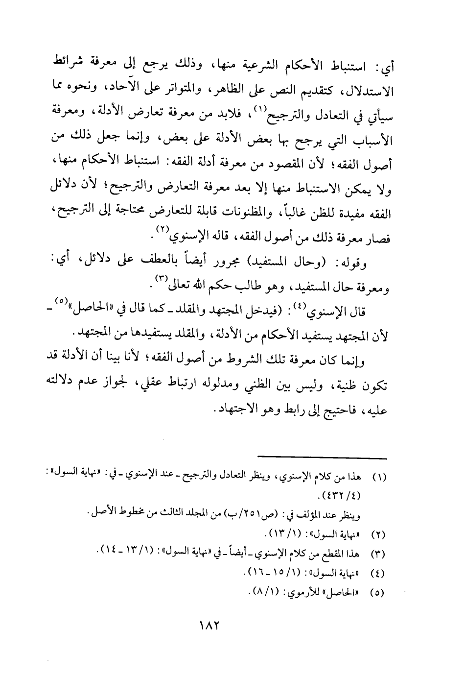 أَي: استنباط الْأَحْكَام الشَّرْعِيَّة مِنْهَا، وَذَلِكَ يرجع إِلَى معرفَة شَرَائِط الِاسْتِدْلَال، كتقديم النَّص على الظَّاهِر، والمتواتر على الْآحَاد، وَنَحْو مِمَّا سَيَأْتِي فِي التعادل وَالتَّرْجِيح، فَلَا بُد من معرفَة تعَارض الْأَدِلَّة، وَمَعْرِفَة الْأَسْبَاب الَّتِي يرجح بهَا بعض الْأَدِلَّة على بعض، وَإِنَّمَا جعل ذَلِك من أصُول الْفِقْه؛ لِأَن الْمَقْصُود من معرفَة أَدِلَّة الْفِقْه: استنباط الْأَحْكَام مِنْهَا، وَلَا يُمكن الاستنباط مِنْهَا إِلَّا بعد معرفَة التَّعَارُض وَالتَّرْجِيح؛ لِأَن دَلَائِل الْفِقْه مفيدة للظن غَالِبا، والمظنونات قَابِلَة للتعارض محتاجه إِلَى التَّرْجِيح، فَصَارَ معرفَة ذَلِك من أصُول الْفِقْه، قَالَه الْإِسْنَوِيّ.