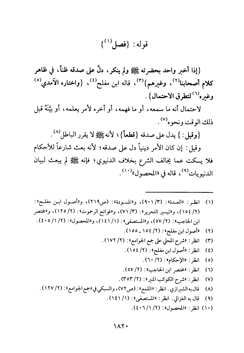 {إِذا أخبر وَاحِد بِحَضْرَتِهِ - صَلَّى اللَّهُ عَلَيْهِ وَسَلَّم َ - وَلم يُنكر، دلّ على صدقه ظنا، فِي ظَاهر كَلَام أَصْحَابنَا، وَغَيرهم} ، قَالَه ابْن مُفْلِح، {وَاخْتَارَهُ الْآمِدِيّ وَغَيره لتطرق الِاحْتِمَال} .