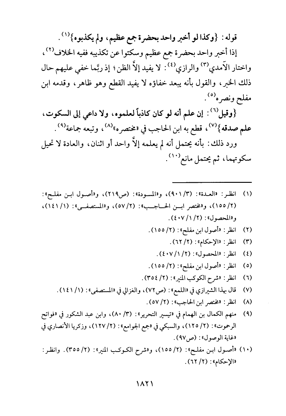 إِذا أخبر وَاحِد بِحَضْرَة جمع عَظِيم وسكتوا عَن تَكْذِيبه فَفِيهِ الْخلاف، وَاخْتَارَ الْآمِدِيّ والرازي: لَا يُفِيد إِلَّا الظَّن؛ إِذْ رُبمَا خَفِي عَلَيْهِم حَال ذَلِك الْخَبَر، وَالْقَوْل بِأَنَّهُ يبعد خفاؤه لَا يُفِيد الْقطع وَهُوَ ظَاهر، وَقدمه ابْن مُفْلِح وَنَصره.