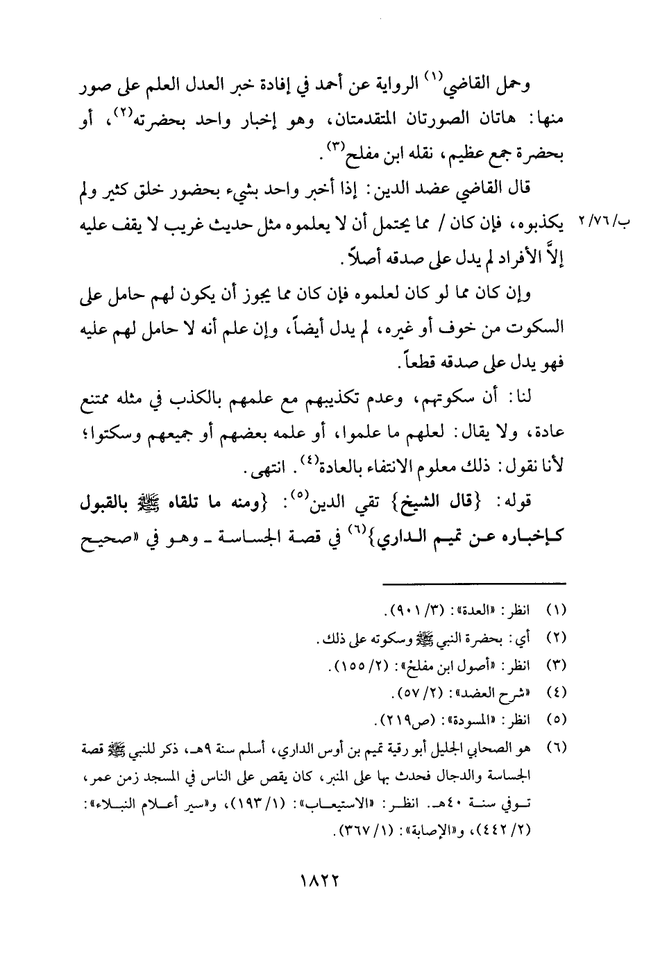 قَوْله: {قَالَ الشَّيْخ} تَقِيّ الدّين: {وَمِنْه مَا تَلقاهُ - صَلَّى اللَّهُ عَلَيْهِ وَسَلَّم َ - بِالْقبُولِ كإخباره عَن تَمِيم الدَّارِيّ} فِي قصَّة الْجَسَّاسَة - وَهُوَ فِي " صَحِيح