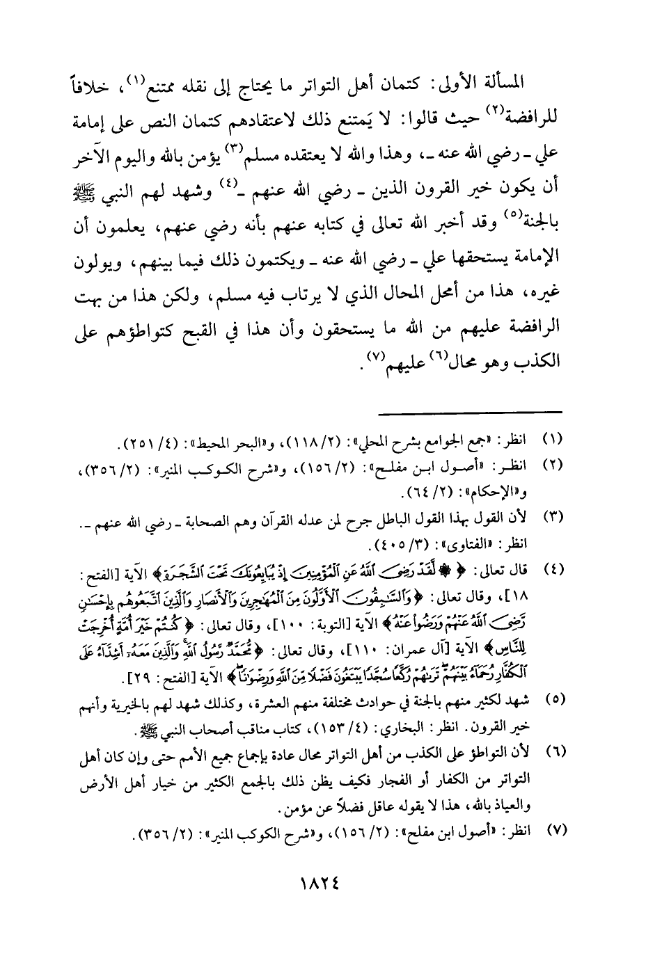 الْمَسْأَلَة الأولى: كتمان أهل التَّوَاتُر مَا يحْتَاج إِلَى نَقله مُمْتَنع، خلافًا للرافضة حَيْثُ قَالُوا: لَا يمْتَنع ذَلِك لاعتقادهم كتمان النَّص على إِمَامَة عَليّ - رَضِي الله عَنهُ -، وَهَذَا وَالله لَا يَعْتَقِدهُ مُسلم يُؤمن بِاللَّه وَالْيَوْم الآخر أَن يكون خير الْقُرُون الَّذين - رَضِي الله عَنْهُم - وَشهد لَهُم النَّبِي - صَلَّى اللَّهُ عَلَيْهِ وَسَلَّم َ - بِالْجنَّةِ وَقد أخبر الله تَعَالَى فِي كِتَابه عَنْهُم بِأَنَّهُ رَضِي عَنْهُم، يعلمُونَ أَن الْإِمَامَة يَسْتَحِقهَا عَليّ - رَضِي الله عَنهُ - ويكتمون ذَلِك فِيمَا بَينهم، وَيُوَلُّونَ غَيره، هَذَا من أمحل الْمحَال الَّذِي لَا يرتاب فِيهِ مُسلم، وَلَكِن هَذَا من بهت الرافضة عَلَيْهِم من الله مَا يسْتَحقُّونَ وَأَن هَذَا فِي الْقبْح كتواطؤهم على الْكَذِب وَهُوَ محَال عَلَيْهِم.