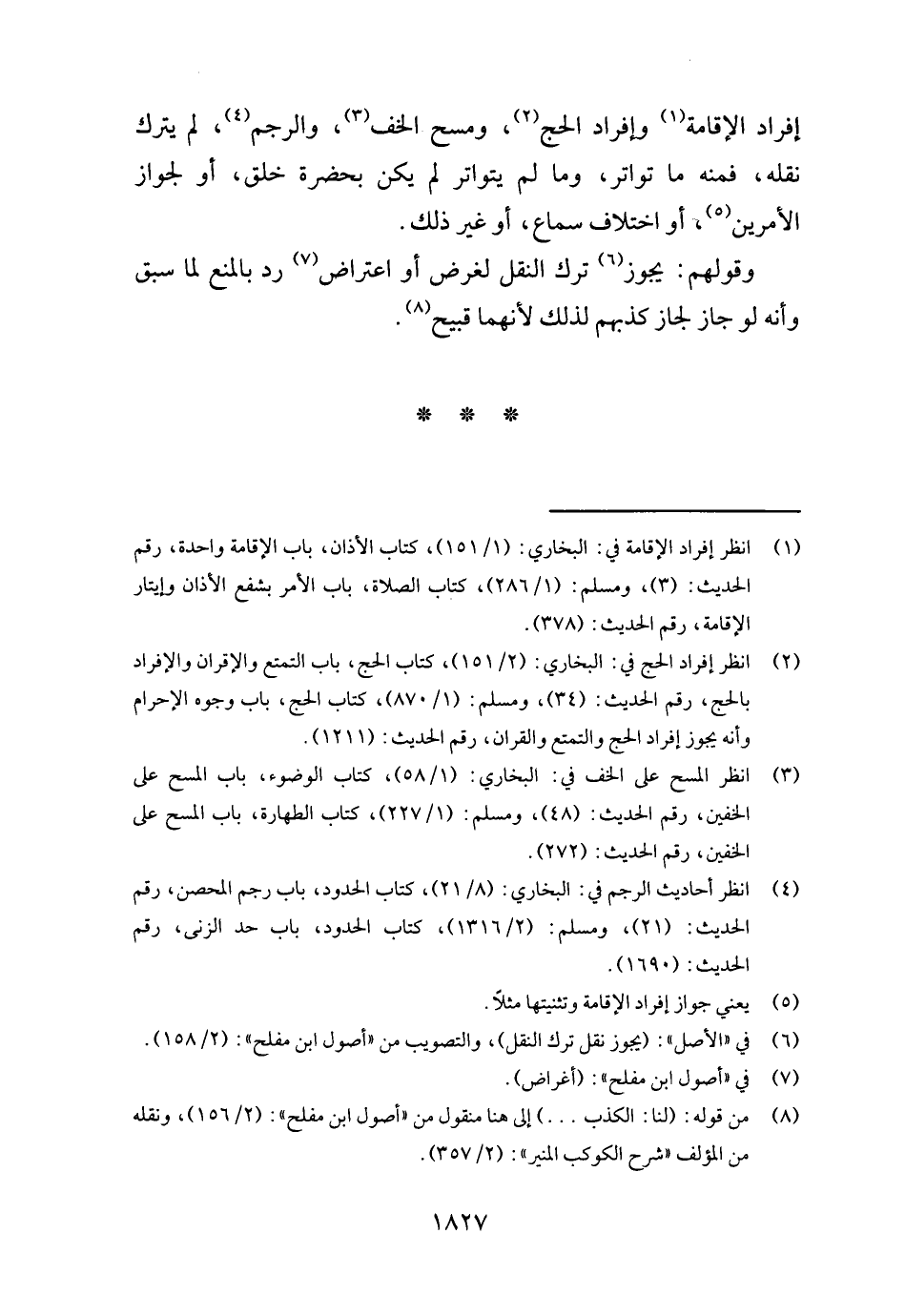 إِفْرَاد الْإِقَامَة وإفراد الْحَج، ومسخ الْخُف، وَالرَّجم، لم يتْرك نَقله، فَمِنْهُ مَا تَوَاتر، وَمَا لم يتواتر لم يكن بِحَضْرَة خلق، أَو لجَوَاز الْأَمريْنِ، أَو اخْتِلَاف سَماع، أَو غير ذَلِك.