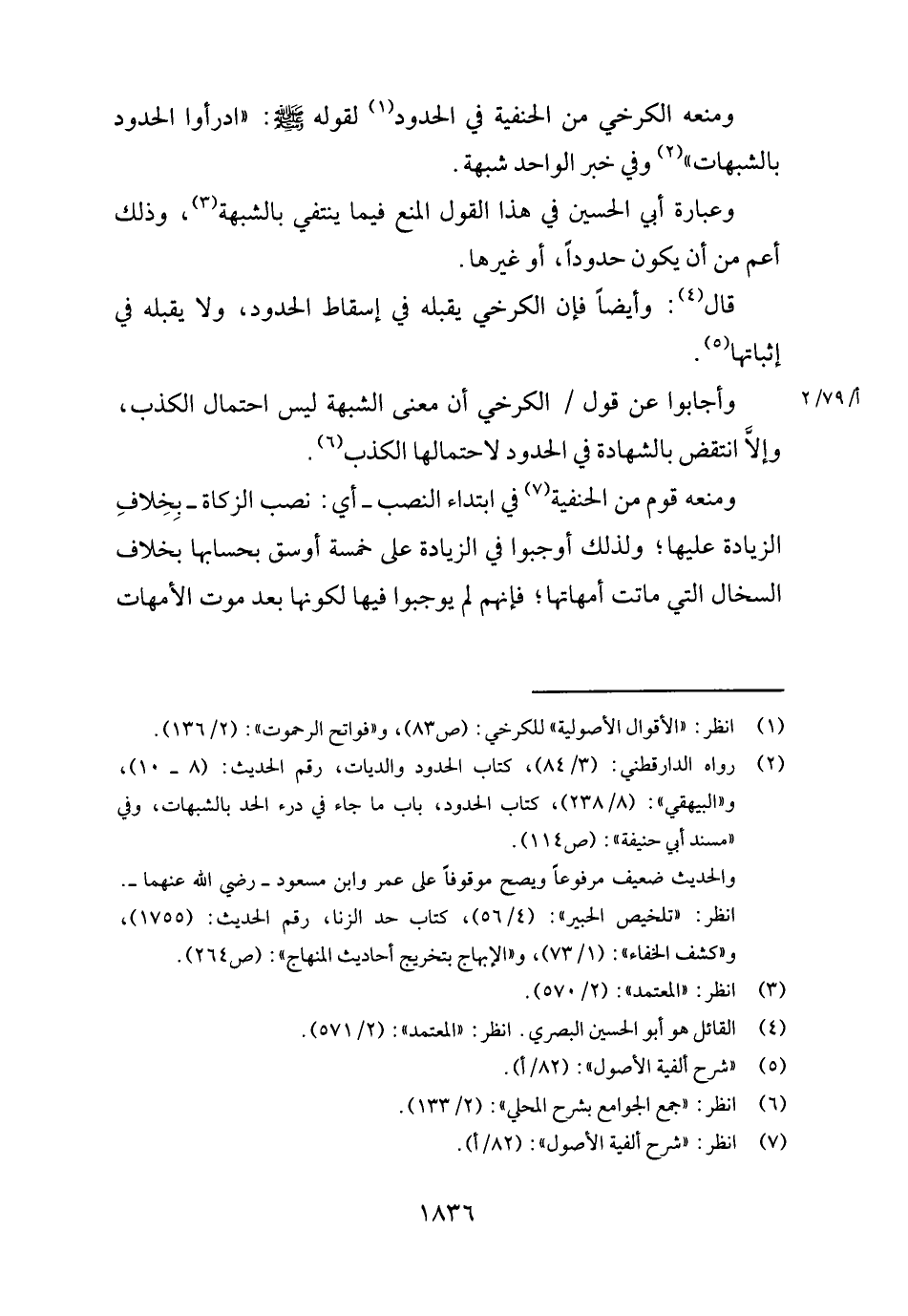 وَعبارَة أبي الْحُسَيْن فِي هَذَا القَوْل الْمَنْع فِيمَا يَنْتَفِي بِالشُّبْهَةِ، وَذَلِكَ أَعم من أَن يكون حدوداً، أَو غَيرهَا.