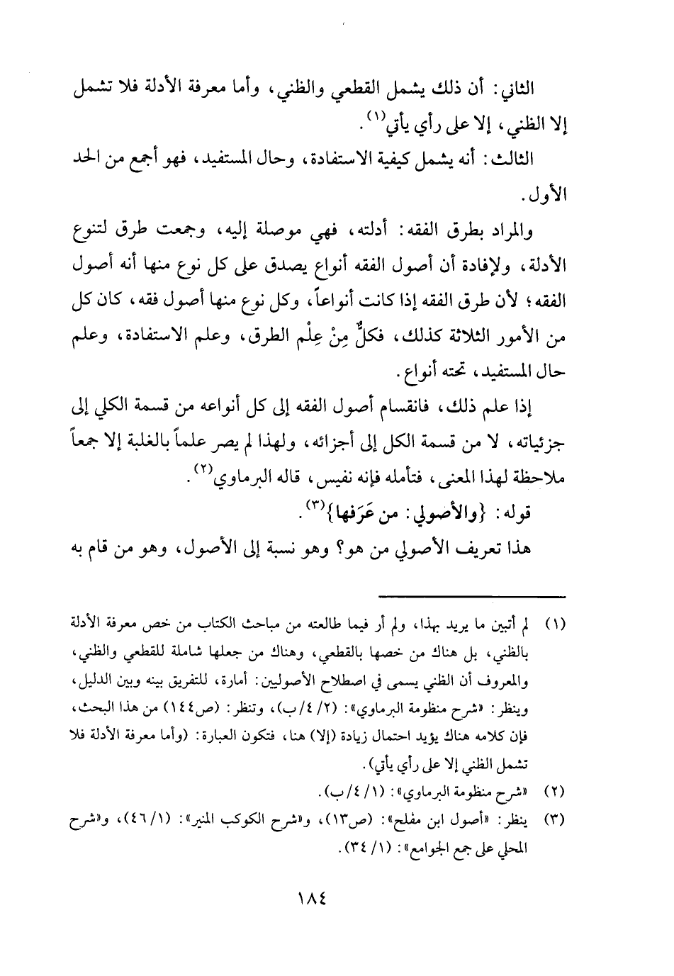 وَالْمرَاد بطرق الْفِقْه: أدلته، فَهِيَ موصلة إِلَيْهِ، وجمعت طرق لتنوع الْأَدِلَّة، ولإفادة أَن أصُول الْفِقْه أَنْوَاع يصدق على كل نوع مِنْهَا أَنه أصُول الْفِقْه؛ لِأَن طرق الْفِقْه إِذا كَانَت أنواعاً، وكل نوع مِنْهَا أصُول فقه، كَانَ كل من الْأُمُور الثَّلَاثَة كَذَلِك، فَكل من علم الطّرق، وَعلم الاستفادة، وَعلم حَال المستفيد، تَحْتَهُ أَنْوَاع.
