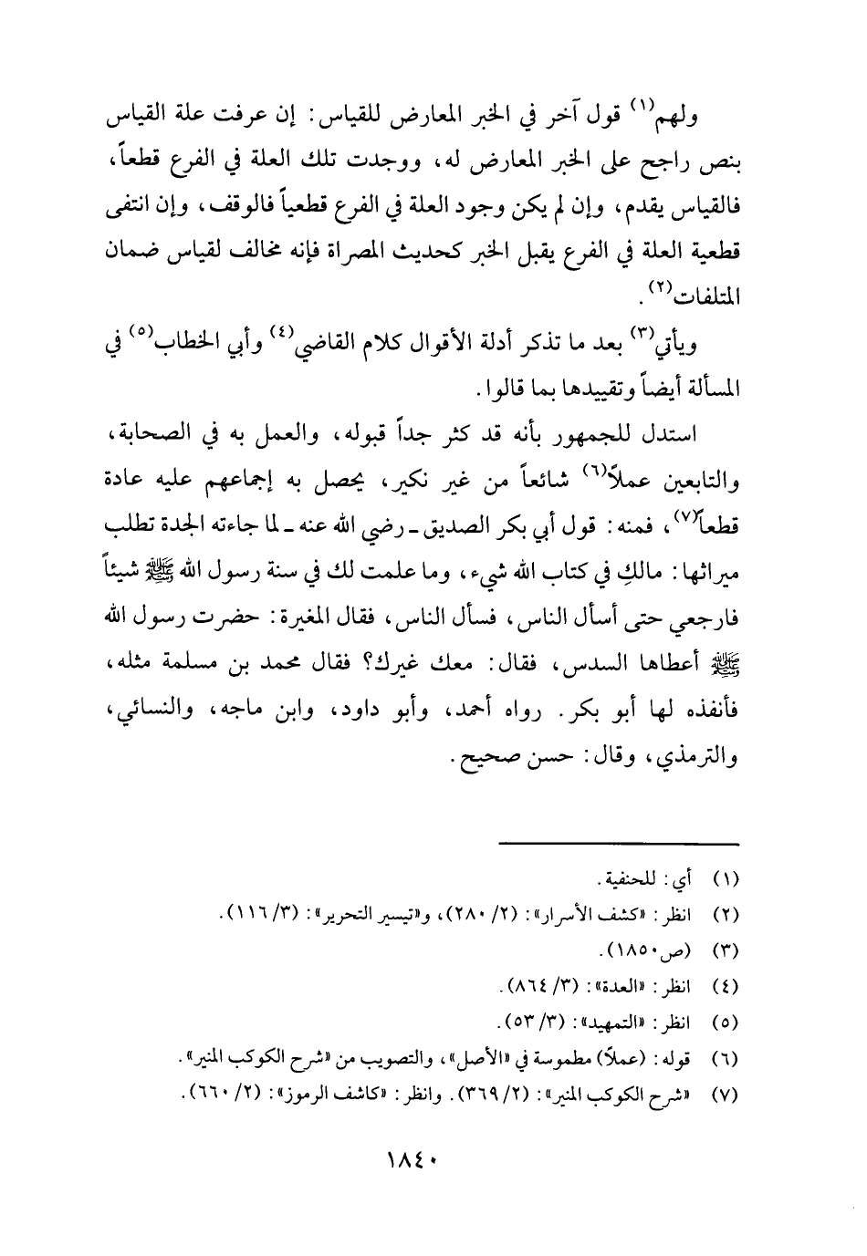 وَلَهُم قَول آخر فِي الْخَبَر الْمعَارض للْقِيَاس: إِن عرفت عِلّة الْقيَاس بِنَصّ رَاجِح على الْخَبَر الْمعَارض لَهُ، وَوجدت تِلْكَ الْعلَّة فِي الْفَرْع قطعا، فَالْقِيَاس يقدم، وَإِن لم يكن وجود الْعلَّة فِي الْفَرْع قَطْعِيا فالوقف، وَإِن انْتَفَى قَطْعِيَّة الْعلَّة فِي الْفَرْع يقبل الْخَبَر كَحَدِيث الْمُصراة فَإِنَّهُ مُخَالف لقياس ضَمَان الْمُتْلفَات.