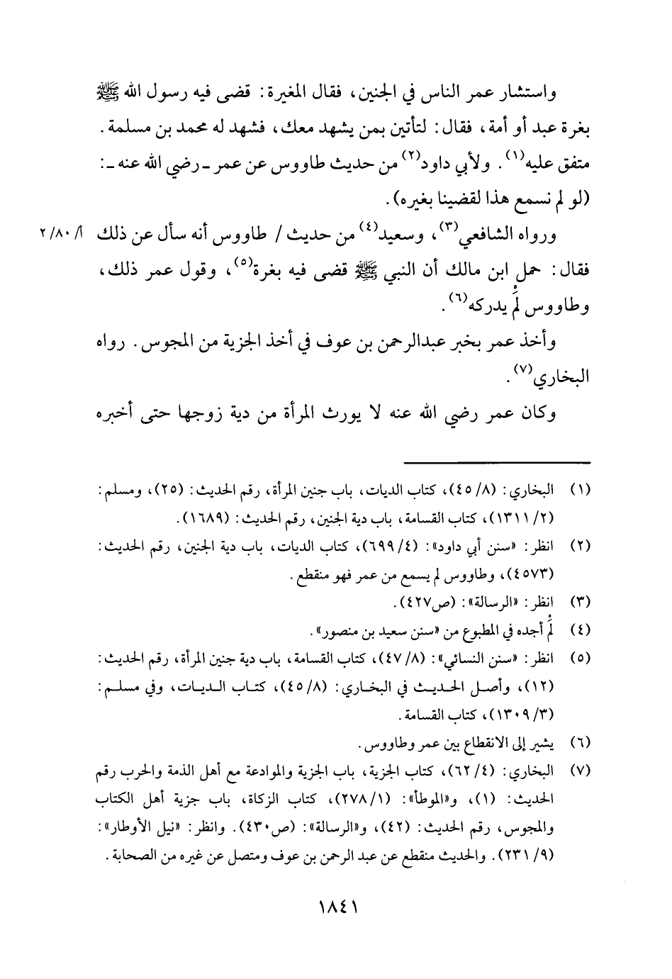 وَاسْتَشَارَ عمر النَّاس فِي الْجَنِين، فَقَالَ الْمُغيرَة، قضى فِيهِ رَسُول الله - صَلَّى اللَّهُ عَلَيْهِ وَسَلَّم َ - بغرة عبد أَو أمة، فَقَالَ: لتأتين بِمن يشْهد مَعَك، فَشهد لَهُ مُحَمَّد بن مسلمة. مُتَّفق عَلَيْهِ. وَلأبي دَاوُد من حَدِيث طَاوُوس عَن عمر - رَضِي الله عَنهُ -: (لَو لم نسْمع هَذَا لقضينا بِغَيْرِهِ) .