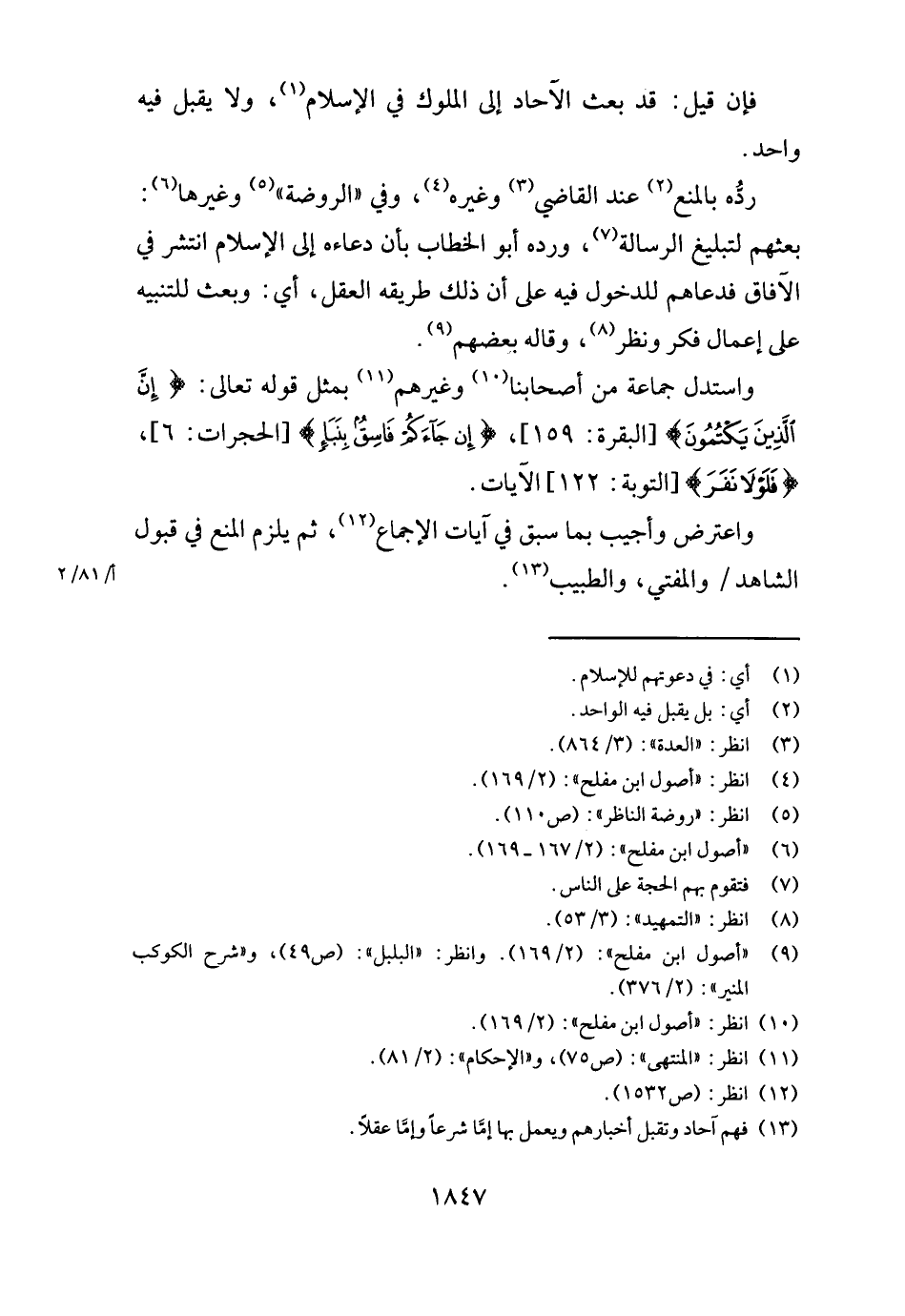 فَإِن قيل: قد بعث الْآحَاد إِلَى الْمُلُوك فِي الْإِسْلَام، وَلَا يقبل فِيهِ وَاحِد.