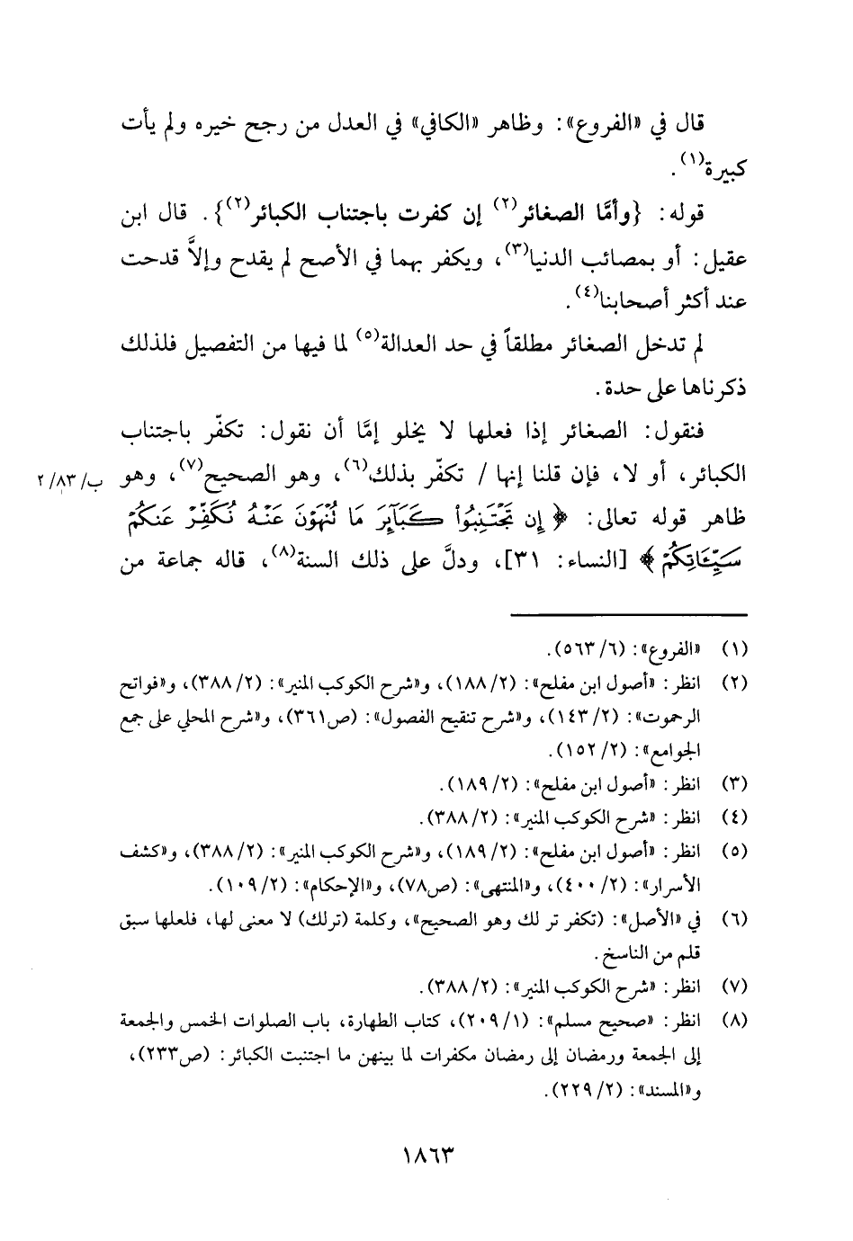فَنَقُول: الصَّغَائِر إِذا فعلهَا لَا يَخْلُو إِمَّا أَن نقُول: تكفر باجتناب الْكَبَائِر، أَو لَا، فَإِن قُلْنَا إِنَّهَا تكفر بذلك، وَهُوَ الصَّحِيح، وَهُوَ ظَاهر قَوْله تَعَالَى: {إِن تجتنبوا كَبَائِر مَا تنهون عَنهُ نكفر عَنْكُم سَيِّئَاتكُمْ} [النِّسَاء: ٣١] ، وَدلّ على ذَلِك السّنة، قَالَه جمَاعَة من