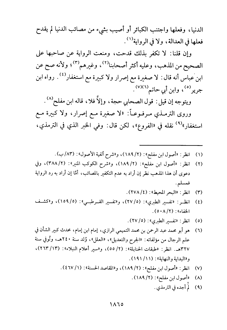 وَإِن قُلْنَا: لَا تكفر بذلك قدحت، ومنعت الرِّوَايَة عَن صَاحبهَا على الصَّحِيح من الْمَذْهَب، وَعَلِيهِ أَكثر أَصْحَابنَا، وَغَيرهم؛ وَلِأَنَّهُ صَحَّ عَن ابْن عَبَّاس أَنه قَالَ: لَا صَغِيرَة مَعَ إِصْرَار وَلَا كَبِيرَة مَعَ اسْتِغْفَار. رَوَاهُ ابْن جرير، وَابْن أبي حَاتِم.