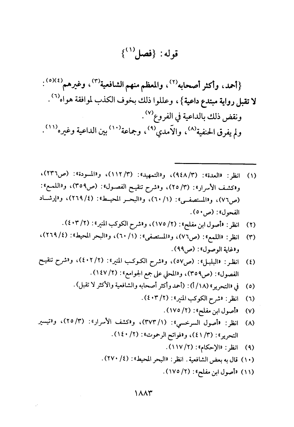 {أَحْمد، وَأكْثر أَصْحَابه، والمعظم مِنْهُم الشَّافِعِيَّة، وَغَيرهم: لَا تقبل رِوَايَة مُبْتَدع دَاعِيَة} ، وعللوا ذَلِك بخوف الْكَذِب لموافقة هَوَاهُ: وَنقض ذَلِك بالداعية فِي الْفُرُوع.