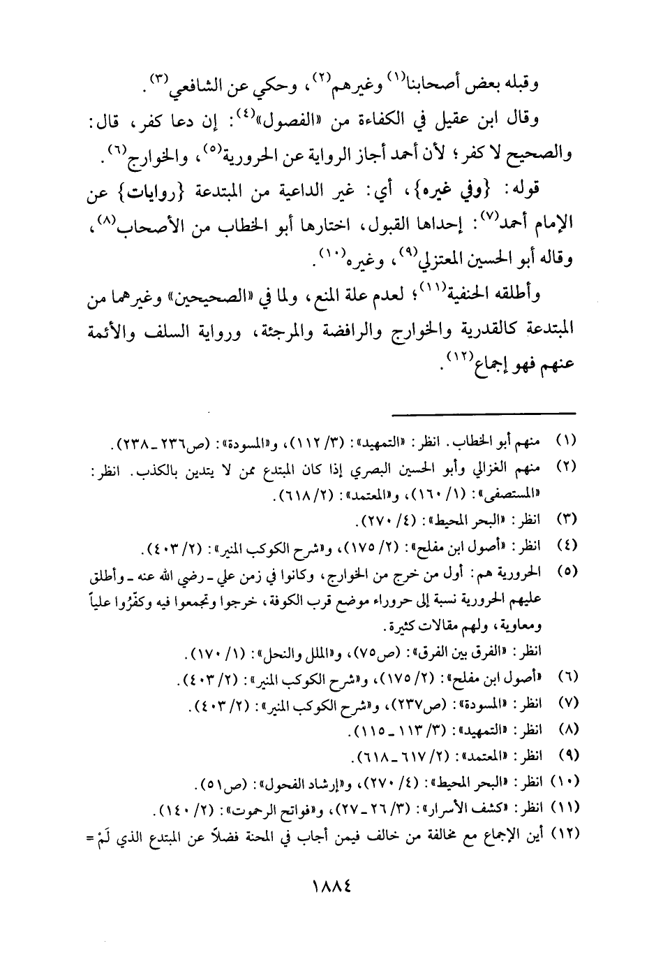 وَقَالَ ابْن عقيل فِي الْكَفَاءَة من " الْفُصُول ": إِن دَعَا كفر، قَالَ: وَالصَّحِيح لَا كفر؛ لِأَن أَحْمد أجَاز الرِّوَايَة عَن الحرورية، والخوارج.
