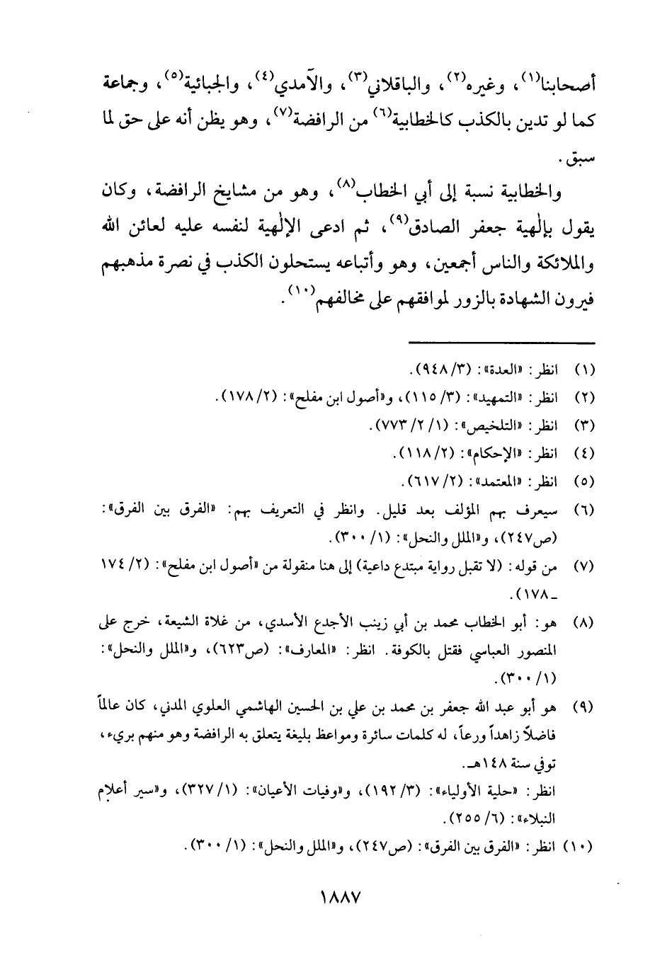 والخطابية نِسْبَة إِلَى أبي الْخطاب، وَهُوَ من مَشَايِخ الرافضة، وَكَانَ يَقُول بإلهية جَعْفَر الصَّادِق، ثمَّ ادّعى الإلهية لنَفسِهِ عَلَيْهِ لعائن الله وَالْمَلَائِكَة وَالنَّاس أَجْمَعِينَ، وَهُوَ وَأَتْبَاعه يسْتَحلُّونَ الْكَذِب فِي نصْرَة مَذْهَبهم فيرون الشَّهَادَة بالزور لموافقهم على مخالفهم.