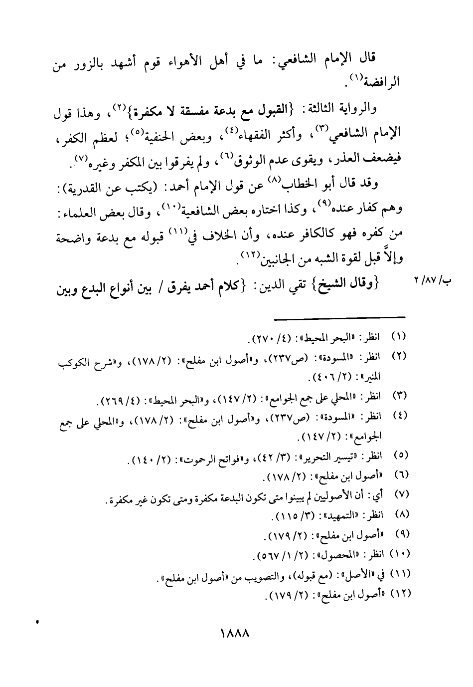 وَقد قَالَ أَبُو الْخطاب عَن قَول الإِمَام أَحْمد: (يكْتب عَن الْقَدَرِيَّة) : وهم كفار عِنْده، وَكَذَا اخْتَارَهُ بعض الشَّافِعِيَّة، وَقَالَ بعض الْعلمَاء: من كفره فَهُوَ كالكافر عِنْده، وَأَن الْخلاف فِي قبُوله مَعَ بِدعَة وَاضِحَة وَإِلَّا قبل لقُوَّة الشّبَه من الْجَانِبَيْنِ. {وَقَالَ الشَّيْخ} تَقِيّ الدّين: {كَلَام أَحْمد يفرق بَين أَنْوَاع الْبدع وَبَين