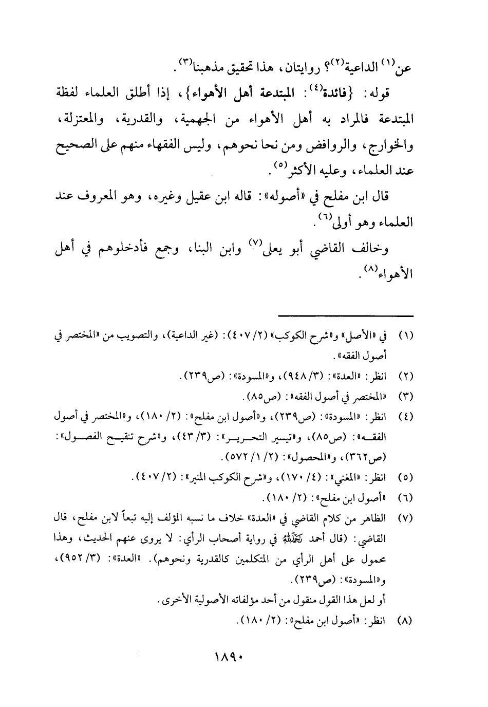 قَوْله: {فَائِدَة: المبتدعة أهل الْأَهْوَاء} ؛ إِذا أطلق الْعلمَاء لَفْظَة المبتدعة فَالْمُرَاد بِهِ أهل الْأَهْوَاء من الْجَهْمِية، والقدرية، والمعتزلة، والخوارج، وَالرَّوَافِض وَمن نحا نحوهم، وَلَيْسَ الْفُقَهَاء مِنْهُم على الصَّحِيح عِنْد الْعلمَاء، وَعَلِيهِ الْأَكْثَر.