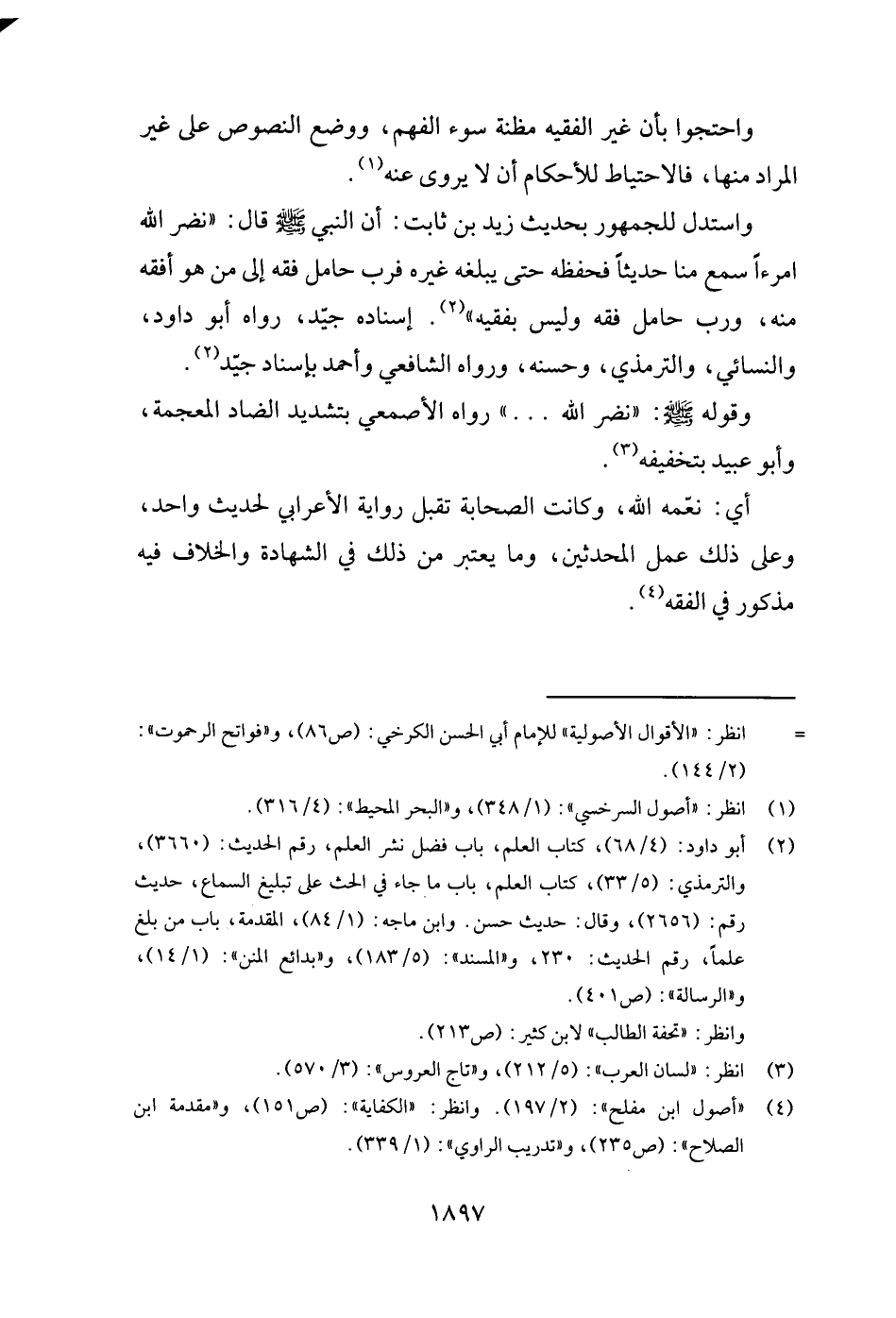 وَاسْتدلَّ لِلْجُمْهُورِ بِحَدِيث زيد بن ثَابت: أَن النَّبِي - صَلَّى اللَّهُ عَلَيْهِ وَسَلَّم َ - قَالَ: " نضر الله امْرَءًا سمع منا حَدِيثا فحفظه حَتَّى يبلغهُ غَيره فَرب حَامِل فقه إِلَى من هُوَ أفقه مِنْهُ وَرب حَامِل فقه وَلَيْسَ بفقيه ". إِسْنَاده جيد، رَوَاهُ أَبُو دَاوُد، وَالنَّسَائِيّ، وَالتِّرْمِذِيّ، وَحسنه، وَرَوَاهُ الشَّافِعِي وَأحمد بِإِسْنَاد جيد.