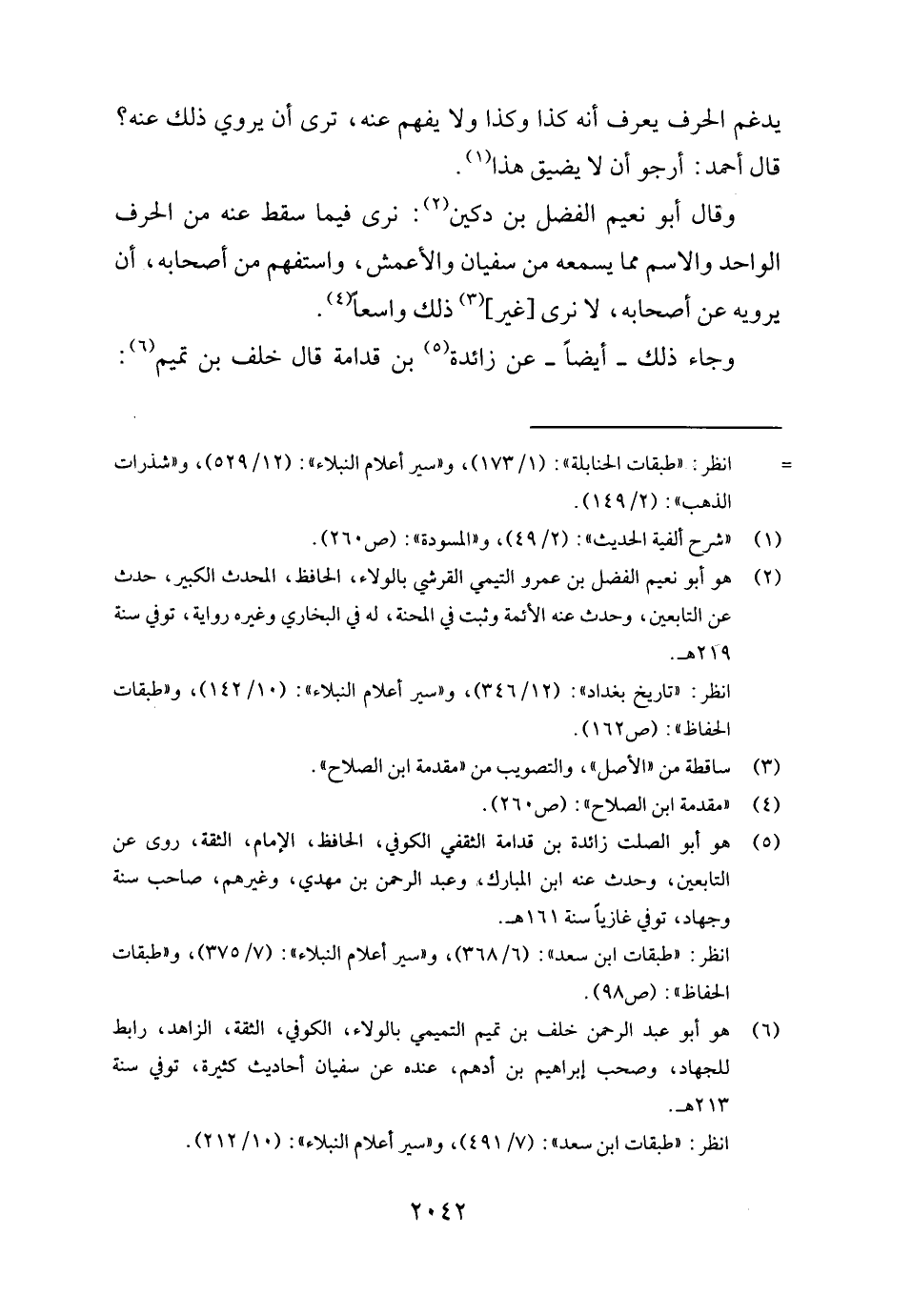 وَقَالَ أَبُو نعيم الْفضل بن دُكَيْن: نرى فِيمَا سقط عَنهُ من الْحَرْف الْوَاحِد وَالِاسْم مِمَّا يسمعهُ من سُفْيَان وَالْأَعْمَش، واستفهم من أَصْحَابه، أَن يرويهِ عَن أَصْحَابه، لَا نرى [غير] ذَلِك وَاسِعًا.