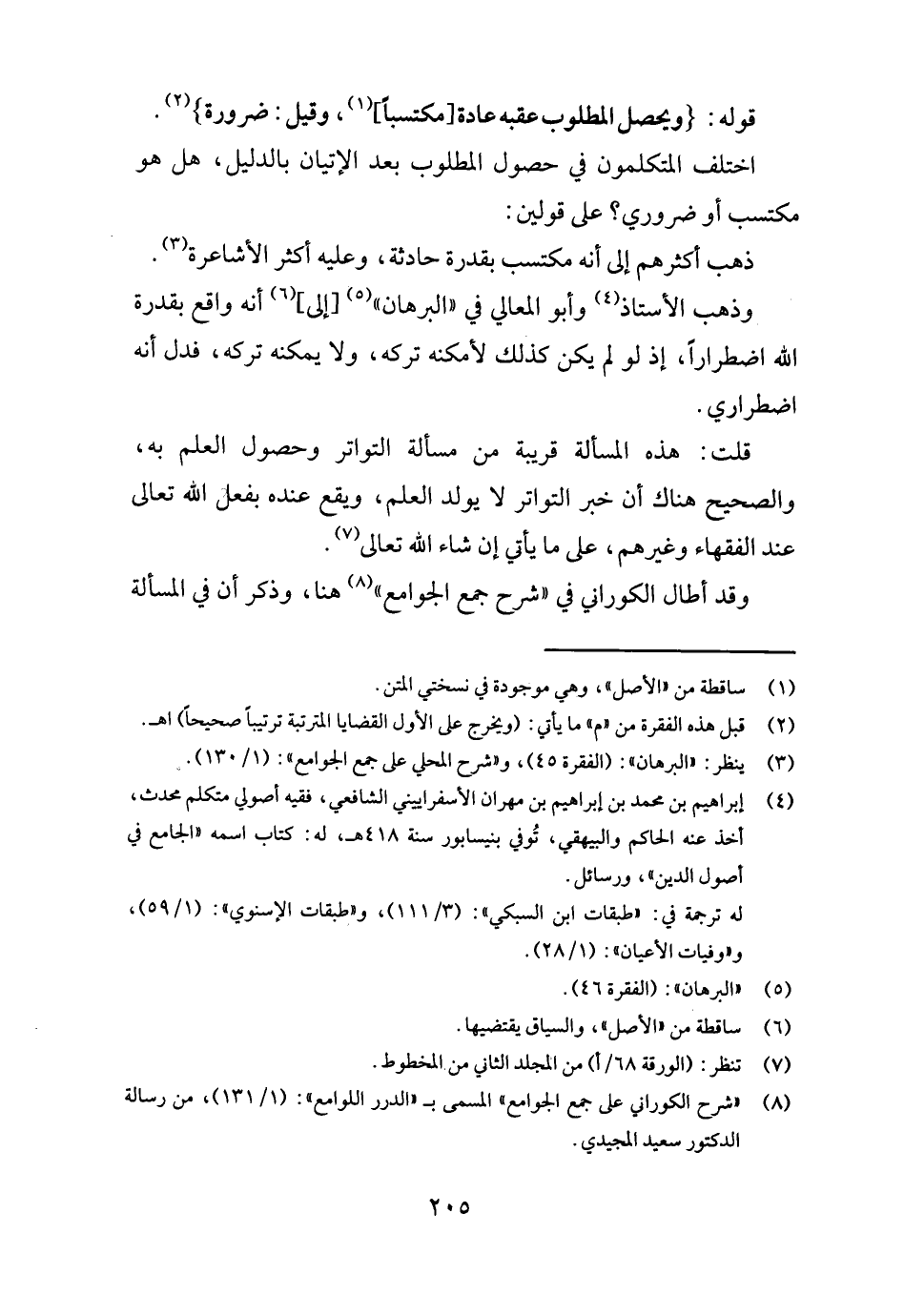 اخْتلف المتكلمون فِي حُصُول الْمَطْلُوب بعد الْإِتْيَان بِالدَّلِيلِ، هَل هُوَ مكتسب أَو ضَرُورِيّ؟ على قَوْلَيْنِ: