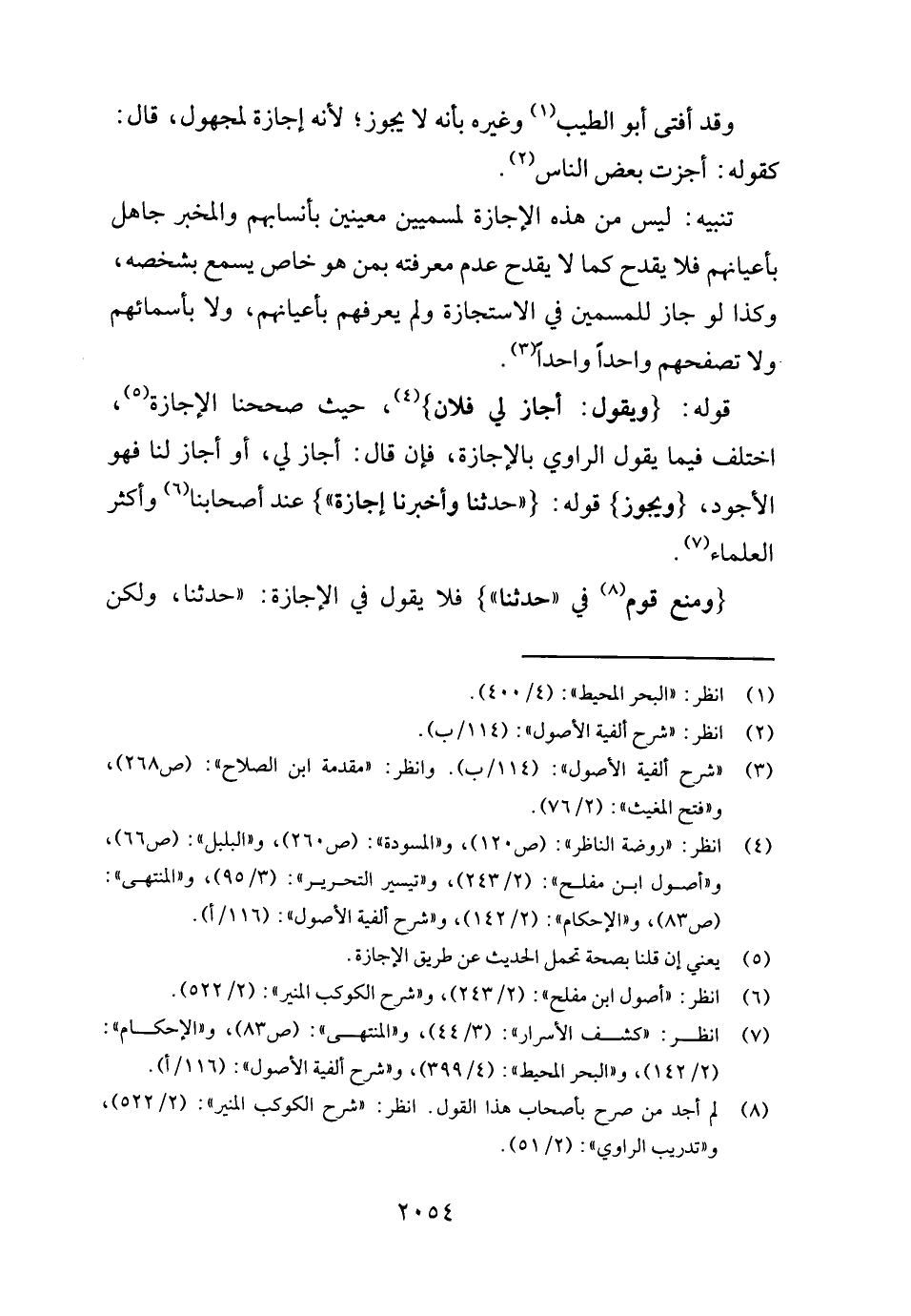 تَنْبِيه: لَيْسَ من هَذِه الْإِجَازَة لمسميين مُعينين بأنسابهم والمخبر جَاهِل بأعيانهم فَلَا يقْدَح كَمَا لَا يقْدَح عدم مَعْرفَته بِمن هُوَ خَاص يسمع بشخصه، وَكَذَا لَو جَازَ للمسمين فِي الاستجازة وَلم يعرفهُمْ بأعيانهم، وَلَا بِأَسْمَائِهِمْ وَلَا تصفحهم وَاحِدًا وَاحِدًا.