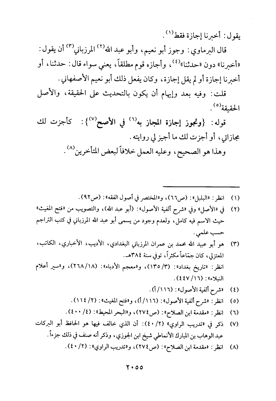 قَالَ الْبرمَاوِيّ: وَجوز أَبُو نعيم، وَأَبُو عبد الله المرزباني أَن يَقُول: " أخبرنَا " دون " حَدثنَا "، وَأَجَازَهُ قوم مُطلقًا، يَعْنِي سَوَاء قَالَ: حَدثنَا، أَو أخبرنَا إجَازَة أَو لم يقل إجَازَة، وَكَانَ يفعل ذَلِك أَبُو نعيم الْأَصْفَهَانِي.
