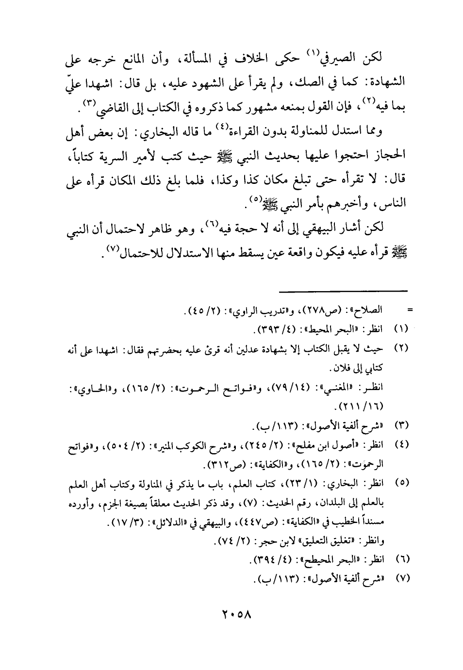لَكِن الصَّيْرَفِي حكى الْخلاف فِي الْمَسْأَلَة، وَأَن الْمَانِع خرجه على الشَّهَادَة: كَمَا فِي الصَّك، وَلم يقْرَأ على الشُّهُود عَلَيْهِ، بل قَالَ: اشهدا عَليّ بِمَا فِيهِ، فَإِن القَوْل بِمَنْعه مَشْهُور كَمَا ذَكرُوهُ فِي الْكتاب إِلَى القَاضِي.