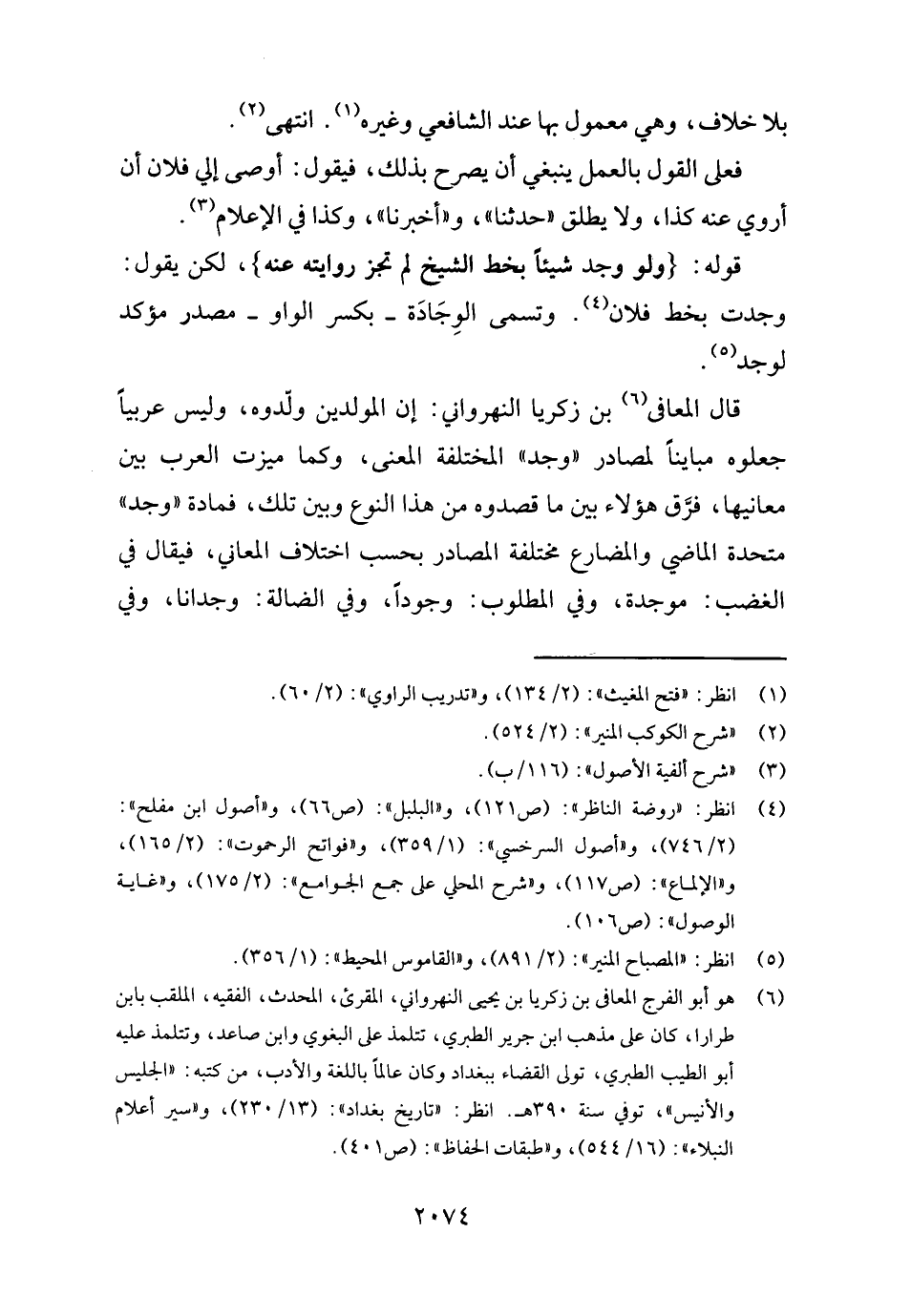 قَالَ الْمعَافى بن زَكَرِيَّا النهرواني: إِن المولدين ولدوه، وَلَيْسَ عَرَبيا جَعَلُوهُ مباينا لمصادر " وجد " الْمُخْتَلفَة الْمَعْنى، وكما ميزت الْعَرَب بَين مَعَانِيهَا، فرق هَؤُلَاءِ بَين مَا قصدوه من هَذَا النَّوْع وَبَين تِلْكَ، فمادة " وجد " متحدة الْمَاضِي والمضارع مُخْتَلفَة المصادر بِحَسب اخْتِلَاف الْمعَانِي، فَيُقَال فِي الْغَضَب: موجدة، وَفِي الْمَطْلُوب: وجودا، وَفِي الضَّالة: وجدانا، وَفِي
