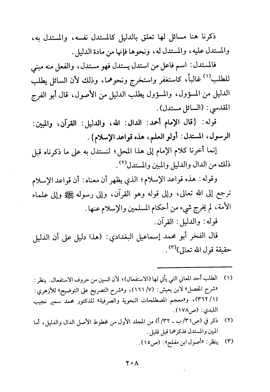 قَوْله: {قَالَ الإِمَام أَحْمد: الدَّال: الله، وَالدَّلِيل: الْقُرْآن، والمبين: الرَّسُول، الْمُسْتَدلّ: أولو الْعلم، هَذِه قَوَاعِد الْإِسْلَام} .