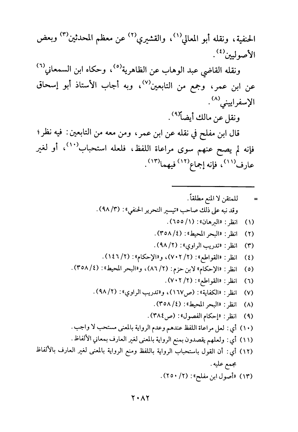 قَالَ ابْن مُفْلِح فِي نَقله عَن ابْن عمر، وَمن مَعَه من التَّابِعين: فِيهِ نظر؛ فَإِنَّهُ لم يَصح عَنْهُم سوى مُرَاعَاة اللَّفْظ، فَلَعَلَّهُ اسْتِحْبَاب، أَو لغير عَارِف، فَإِنَّهُ إِجْمَاع فيهمَا.