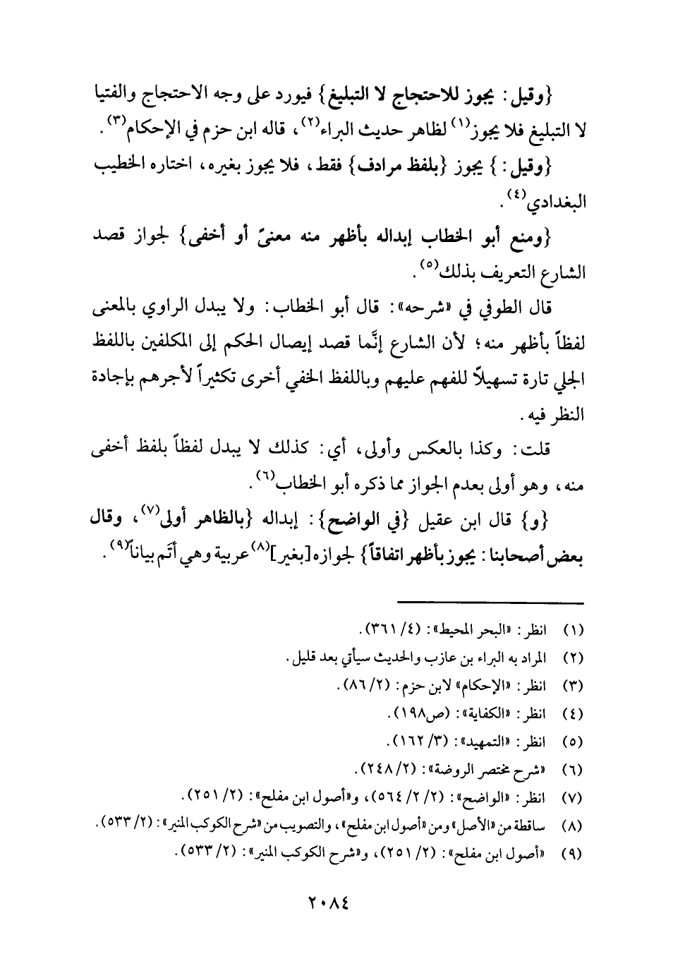 قَالَ الطوفي فِي " شَرحه ": قَالَ أَبُو الْخطاب: وَلَا يُبدل الرَّاوِي بِالْمَعْنَى لفظا بأظهر مِنْهُ؛ لِأَن الشَّاعِر إِنَّمَا قصد إِيصَال الحكم إِلَى الْمُكَلّفين بِاللَّفْظِ الْجَلِيّ تَارَة تسهيلا للفهم عَلَيْهِم وباللفظ الْخَفي أُخْرَى تكثيرا لأجرهم بإجادة النّظر فِيهِ.