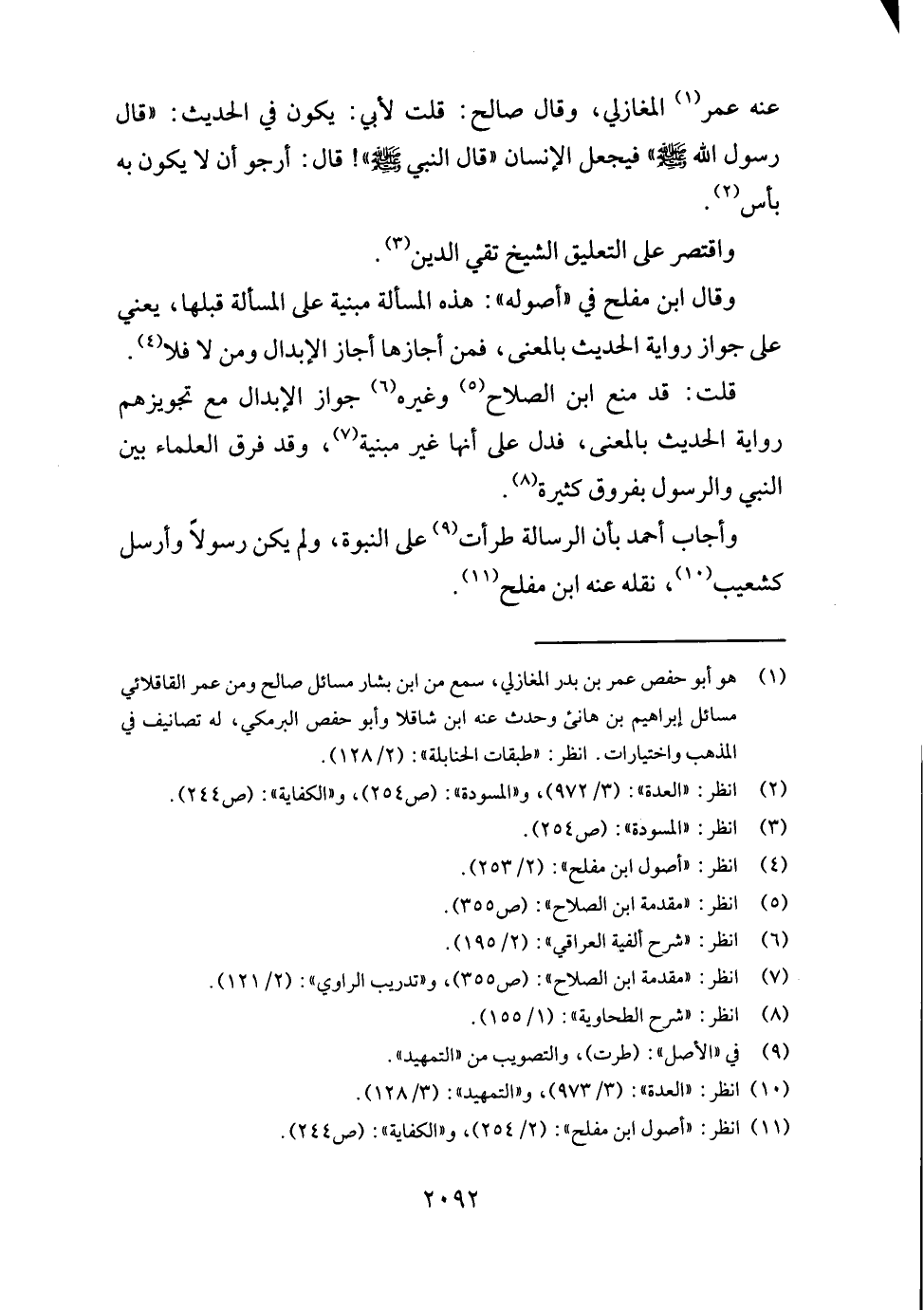 وَقَالَ ابْن مُفْلِح فِي " أُصُوله ": هَذِه الْمَسْأَلَة مَبْنِيَّة على الْمَسْأَلَة قبلهَا، يَعْنِي على جَوَاز رِوَايَة الحَدِيث بِالْمَعْنَى، فَمن أجازها أجَاز الْإِبْدَال وَمن لَا فَلَا.