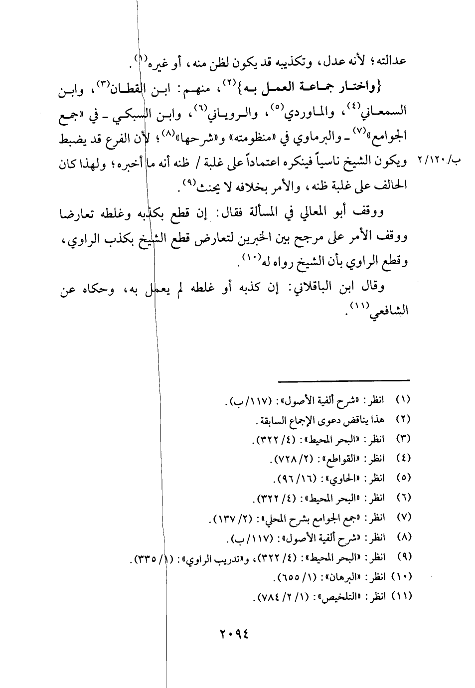 ووقف أَبُو الْمَعَالِي فِي الْمَسْأَلَة فَقَالَ: إِن قطع بكذبه وغلطه تَعَارضا ووقف الْأَمر على مُرَجّح بَين الْخَبَرَيْنِ لتعارض قطع الشَّيْخ بكذب الرَّاوِي، وَقطع الرَّاوِي بِأَن الشَّيْخ رَوَاهُ لَهُ.