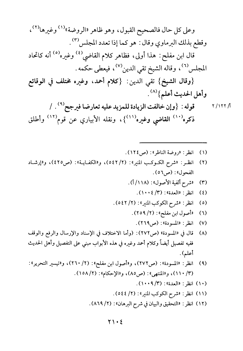 {وَقَالَ الشَّيْخ} تَقِيّ الدّين: {كَلَام أَحْمد، وَغَيره مُخْتَلف فِي الوقائع وَأهل الحَدِيث أعلم} .