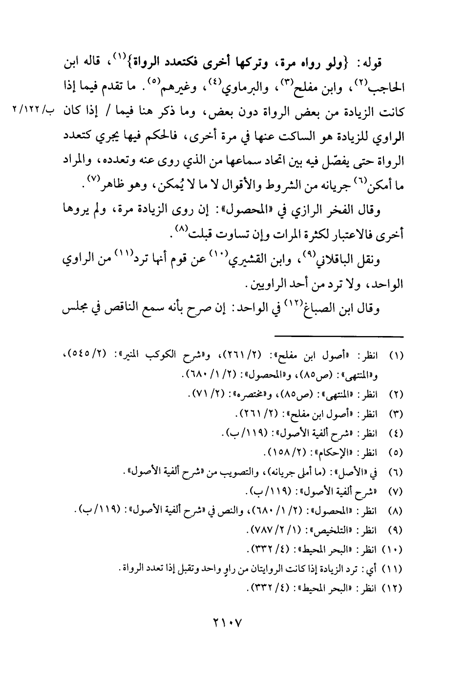 قَوْله: {وَلَو رَوَاهُ مرّة، وَتركهَا أُخْرَى فكتعدد الروَاة} ، قَالَه ابْن الْحَاجِب، وَابْن مُفْلِح، والبرماوي، وَغَيرهم. مَا تقدم فِيمَا إِذا كَانَت الزِّيَادَة من بعض الروَاة دون بعض، وَمَا ذكر هُنَا فِيمَا إِذا كَانَ الرَّاوِي للزِّيَادَة هُوَ السَّاكِت عَنْهَا فِي مرّة أُخْرَى، فَالْحكم فِيهَا يجْرِي كتعدد الروَاة حَتَّى يفصل فِيهِ بَين اتِّحَاد سماعهَا من الَّذِي روى عَنهُ وتعدده، وَالْمرَاد مَا أمكن جَرَيَانه من الشُّرُوط والأقوال لَا مَا لَا يُمكن، وَهُوَ ظَاهر.
