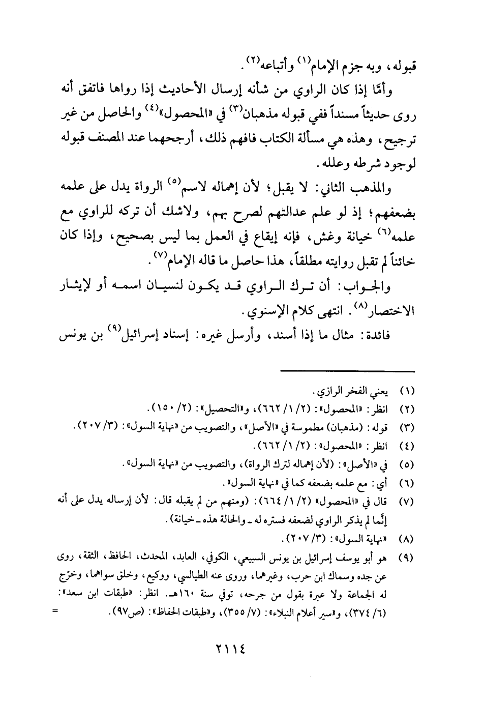 وَالْمذهب الثَّانِي: لَا يقبل؛ لِأَن إهماله لاسم الروَاة يدل على علمه بضعفهم؛ إِذْ لَو علم عدالتهم لصرح بهم، وَلَا شكّ أَن تَركه للراوي مَعَ علمه خِيَانَة وغش، فَإِنَّهُ إِيقَاع فِي الْعَمَل بِمَا لَيْسَ بِصَحِيح، وَإِذا كَانَ خائنا لم تقبل رِوَايَته مُطلقًا، هَذَا حَاصِل مَا قَالَه الإِمَام.