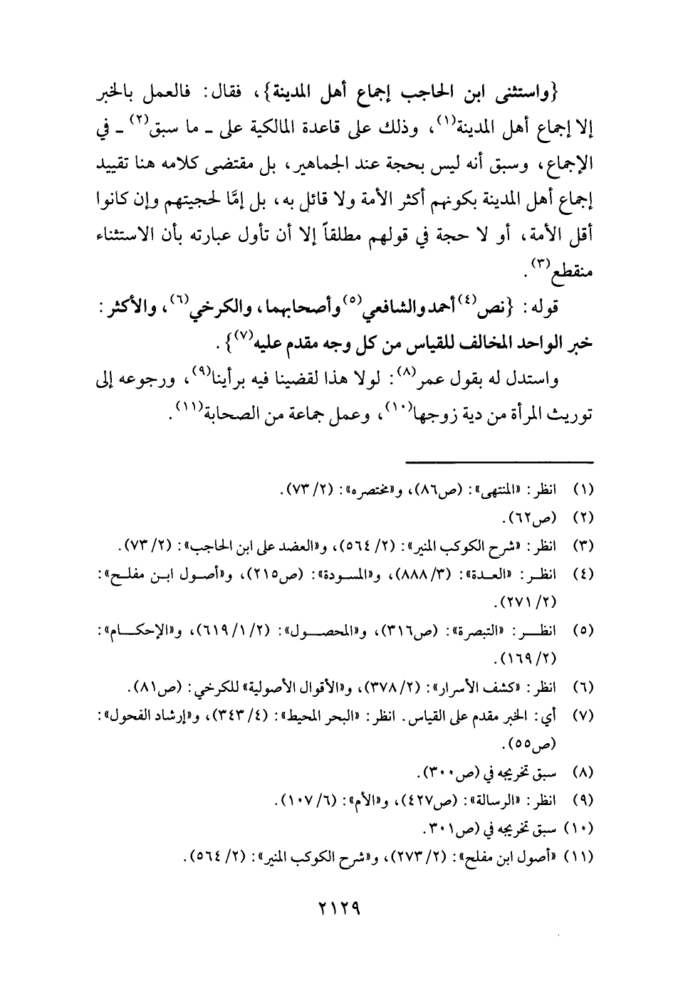 {وَاسْتثنى ابْن الْحَاجِب إِجْمَاع أهل الْمَدِينَة} ، فَقَالَ: فَالْعَمَل بالْخبر إِلَّا إِجْمَاع أهل الْمَدِينَة، وَذَلِكَ على قَاعِدَة الْمَالِكِيَّة على - مَا سبق - فِي الْإِجْمَاع، وَسبق أَنه لَيْسَ بِحجَّة عِنْد الجماهير، بل مُقْتَضى كَلَامه هُنَا تَقْيِيد إِجْمَاع أهل الْمَدِينَة بكونهم أَكثر الْأمة وَلَا قَائِل بِهِ، بل إِمَّا لحجيتهم وَإِن كَانُوا أقل الْأمة، أَو لَا حجَّة فِي قَوْلهم مُطلقًا إِلَّا أَن تَأَول عِبَارَته بِأَن الِاسْتِثْنَاء مُنْقَطع.