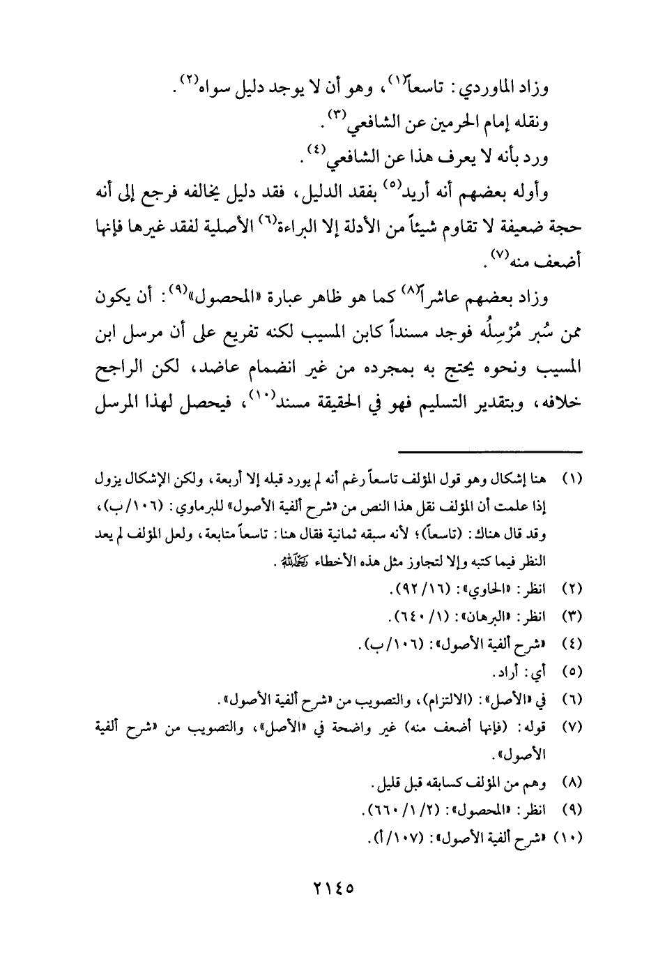 وَزَاد الْمَاوَرْدِيّ: تاسعا، وَهُوَ أَن لَا يُوجد دَلِيل سواهُ؟