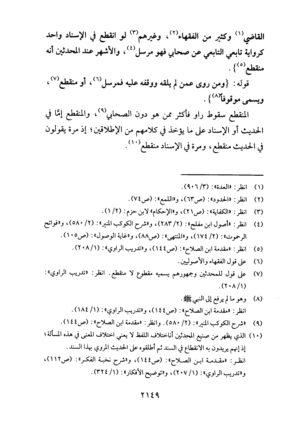 القَاضِي وَكثير من الْفُقَهَاء، وَغَيرهم لَو انْقَطع فِي الْإِسْنَاد وَاحِد كَرِوَايَة تَابِعِيّ التَّابِعِيّ عَن صَحَابِيّ فَهُوَ مُرْسل، وَالْأَشْهر عِنْد الْمُحدثين أَنه مُنْقَطع} .