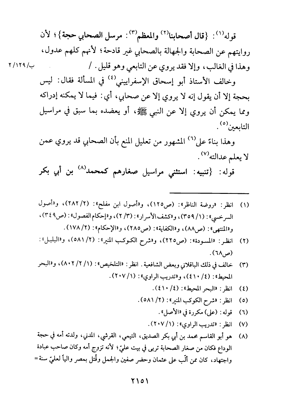قَوْله: {تَنْبِيه: اسْتثْنِي مَرَاسِيل صغارهم كمحمد بن أبي بكر